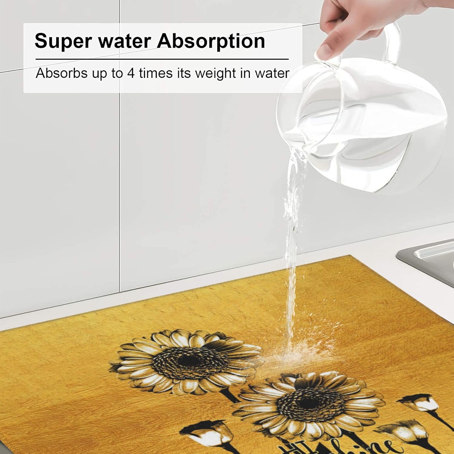 Sunflower Dish Drying Mat for Kitchen Counter Black Gold Washable Absorbent Reversible Microfiber Modern Drying Pad Kitchen Accessories 16x18 Inch