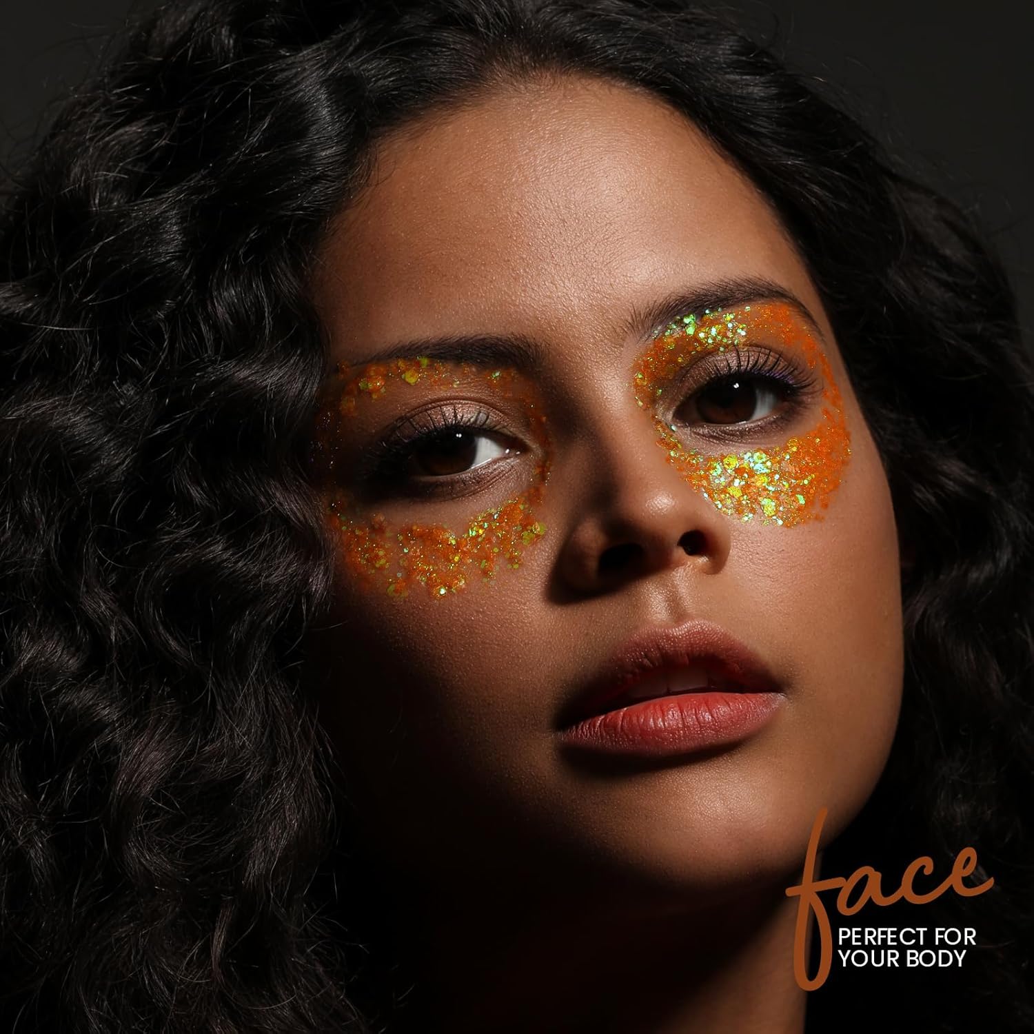 - Travel-Friendly, Perfect for Any Event: Packed with 80 grams of sparkling goodness, our jar is not only generously sized but also compact enough to slip into your bag for on the go glam. Make every occasion sparkle, whether you're at home or on the move! From everyday sparkle to holiday cheer, concerts, parties, and celebrations, our orange body glitter gel transforms your look instantly.