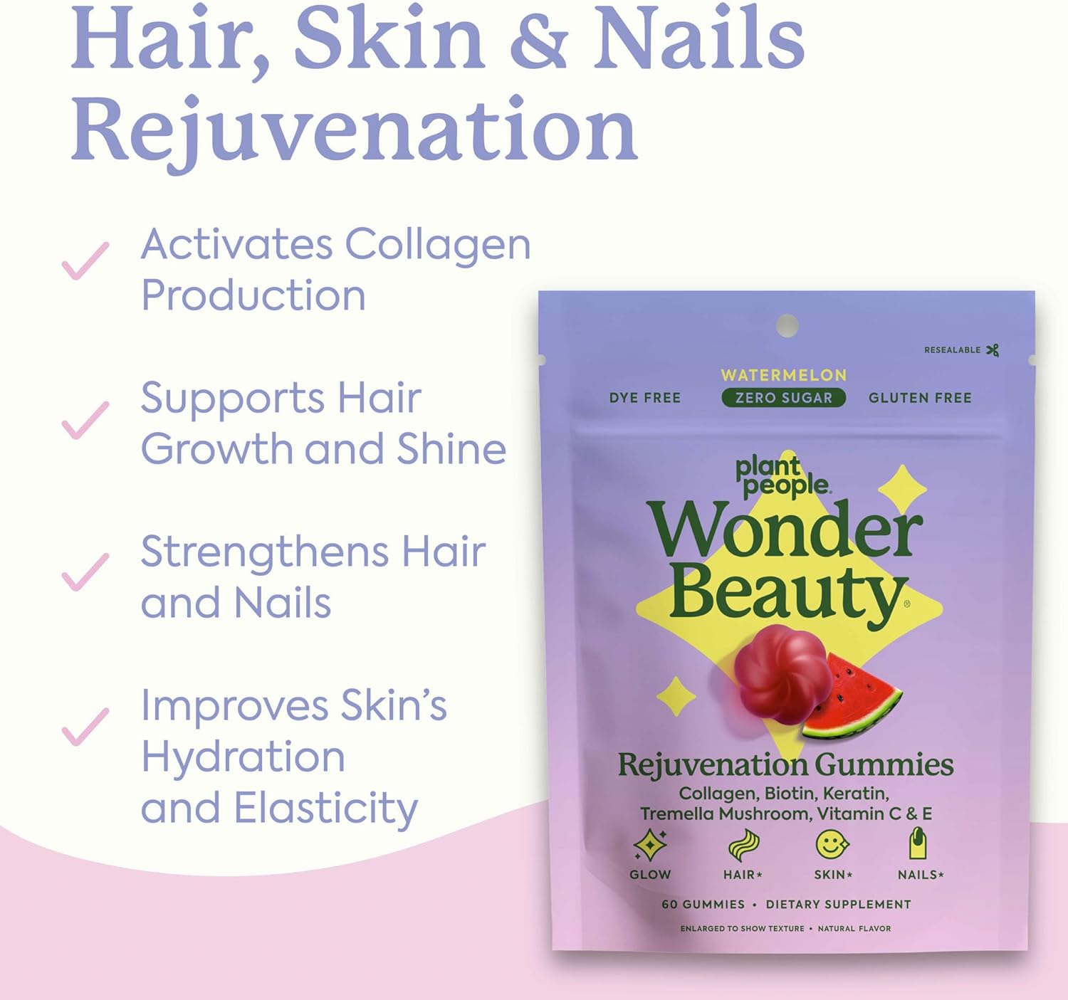 Plant People WonderBeauty Hair, Skin & Nails Rejuvenation Gummies with Tremella Mushroom, Marine Collagen Peptides, Keratin, & Biotin – Watermelon Flavor, 60 Gummies