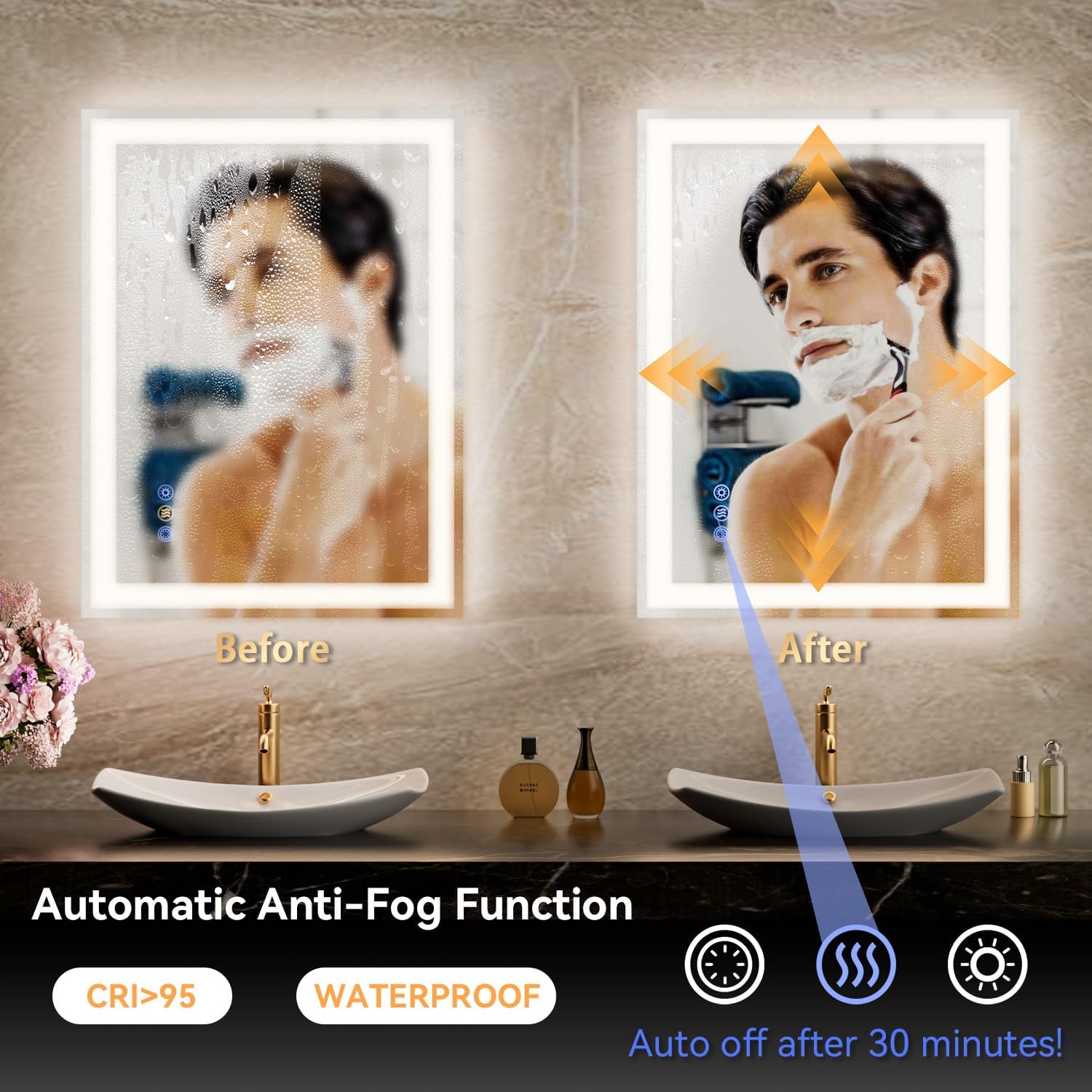 - 【24x36in Smart Mirror with Memory & Anti-Fog Function】This smart LED bathroom mirror is equipped with a memory function that recalls your last brightness color temperature and anti-fog settings, saving time every time you use it. The built-in fast-heating anti-fog feature activates a safe heating coil that begins clearing the mirror from the center outward within 3 minutes. Smart, safe, and efficient—designed for modern daily use