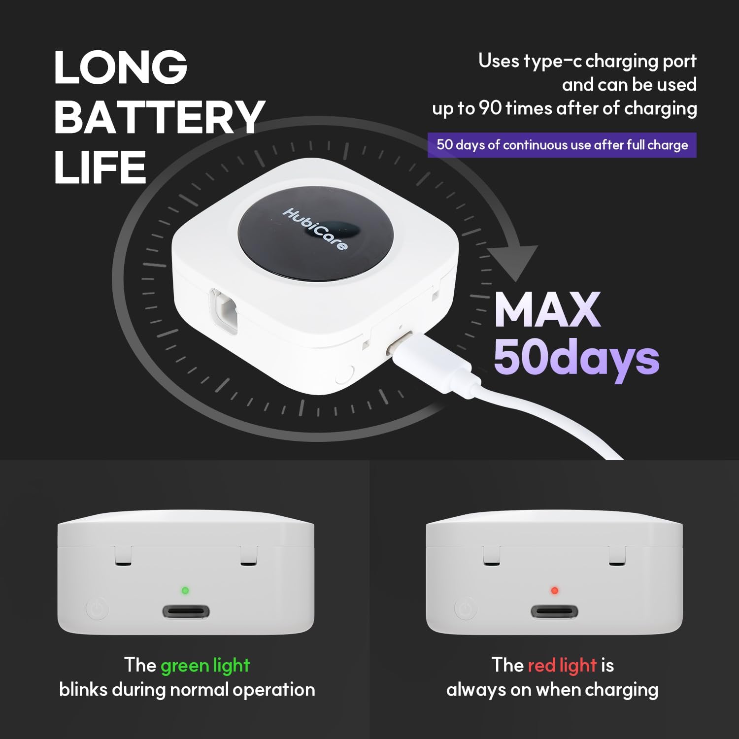 - ✅【Over 50 Days Life】HubiCare Toothbrush Cleaner uses a 300mAh battery and charges with a USB-C type cable. It can be used for more than 50 days when fully charged. One charge can be used for one month. When the battery is low, the red LED will flash, and it will be steady while charging. It will turn green when charging is complete.