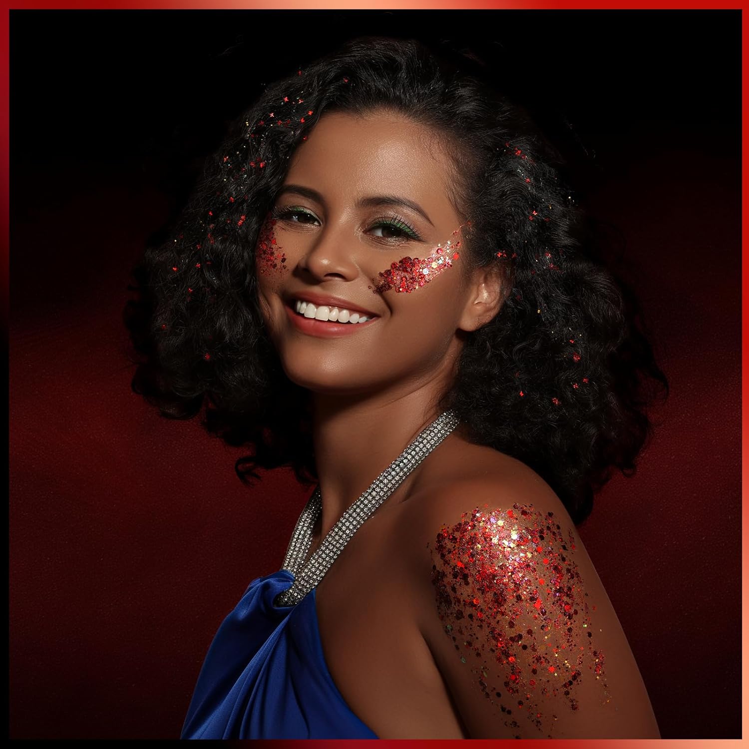 - 6 SHAPES BODY GLITTER GEL - This red body glitter set included very fine glitter, hexagon glitter, the stars and the moon glitter, butterflies and love heart glitter, shining shredded paper glitter, four-angle star glitter. This is a great set of six different glitters that are all different sizes of red glitter