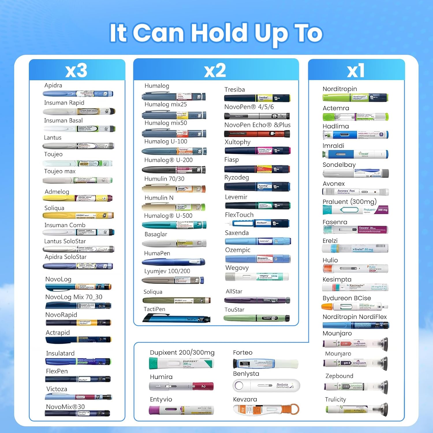 - Universal Compatibility:Insulin pen cooler travel case works with 99% of insulin pens (Humalog, Januvia, Admelog, etc.). Unsure if yours fits? Check our size guide or message us—we’ll help confirm! ONLYCARE insulin pen cooler is reliable for long-haul travel, or day trips with temperature-sensitive medications