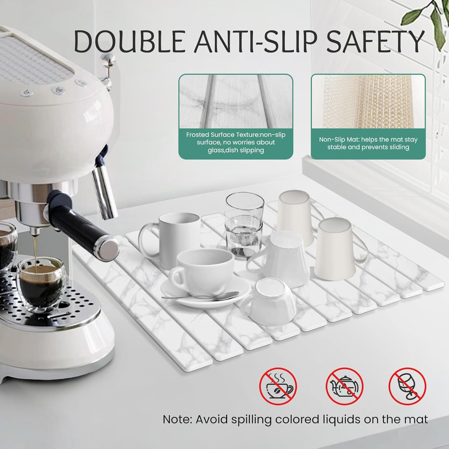 - 【Easy To Clean And Maintain】: Our coffee mats for countertop are flat and and are not easy to accumulate grime.Cleaning tips:Ordinary water stains can be washed with wet cloth or water; Moderate stains can be cleaned with a cleaning brush;When stubborn stains or water absorption is weakened,use the sandpaper to polish the surface to restore rapid water absorption function.Easy to manage and effortless, understanding life better understands you.It is a practical foldable mat say goodbye to tedious tasks, perfect for busy kitchen families.