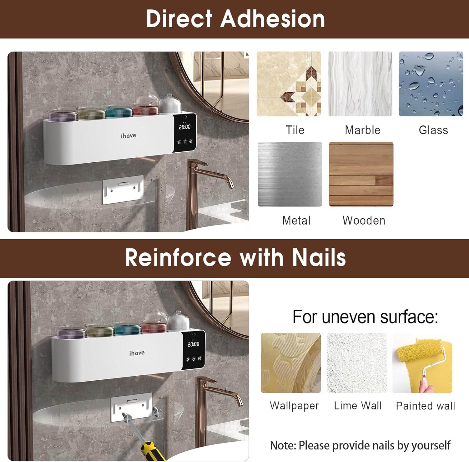 - Easy to Install: The toothbrush holder wall mounted use a non-marking adhesive strip firmly to tiles, mirrors, or marble, holding up to 5kg even in 90% humidity. For uneven walls or wallpapers, we have reserved holes and nails for you to easily face.