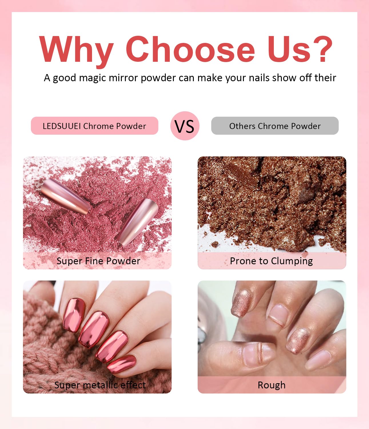 - Ultra Excellent Texture: BISHENGYF nail chrome powder is super fine in texture, without particles feeling with attractive luster, which can be applied effortlessly in just 2-3mins. And it doesn't get messy when you're using it, resulting in glitter everywhere!