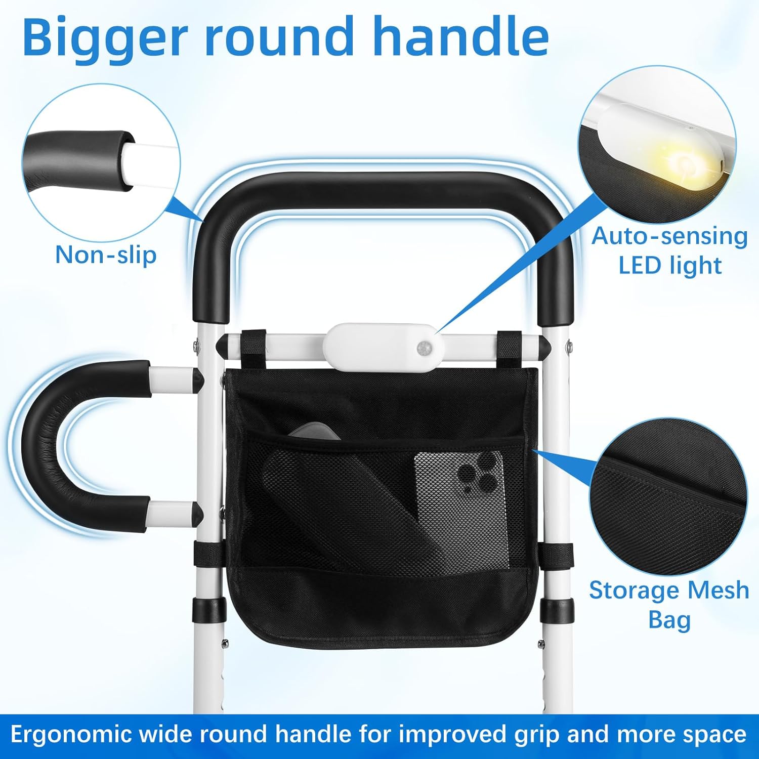 - ăWider NON-SLIP HANDRAILăThe Senior Bed rail Handrail features non-slip foam padding on both rails and side rails with wider and smaller handles. Elderly assistance products provides a secure and comfortable grip. Quality side pockets for easy storage. Side rails and sturdy frame grasp up to 300 pounds to help seniors get in and out of bed safely