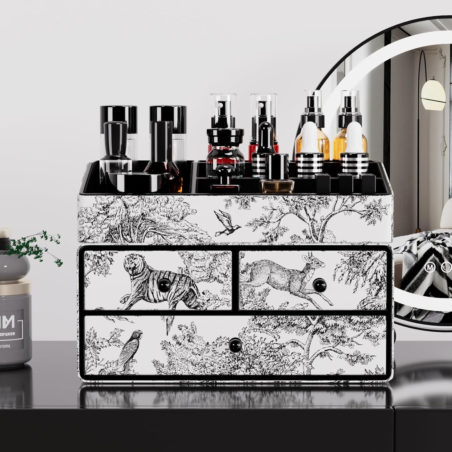 - Unique Gift: The leather makeup organizer for vanity features retro black jungle-themed patterns, with the design distribution unique to each skin care organizer, making every piece one of a kind. Itâs a fantastic gift for women on birthdays, Valentineâs Day, Mother's Day, Thanksgiving, Christmas, and other special occasions.