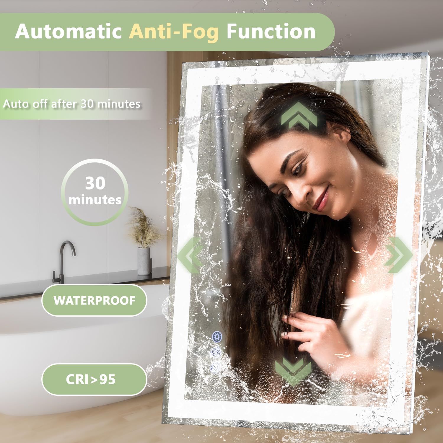 - 【30x36in Smart Mirror with Memory & Anti-Fog Function】This smart LED bathroom mirror is equipped with a memory function that recalls your last brightness color temperature and anti-fog settings, saving time every time you use it. The built-in fast-heating anti-fog feature activates a safe heating coil that begins clearing the mirror from the center outward within 3 minutes. Smart, safe, and efficient—designed for modern daily use