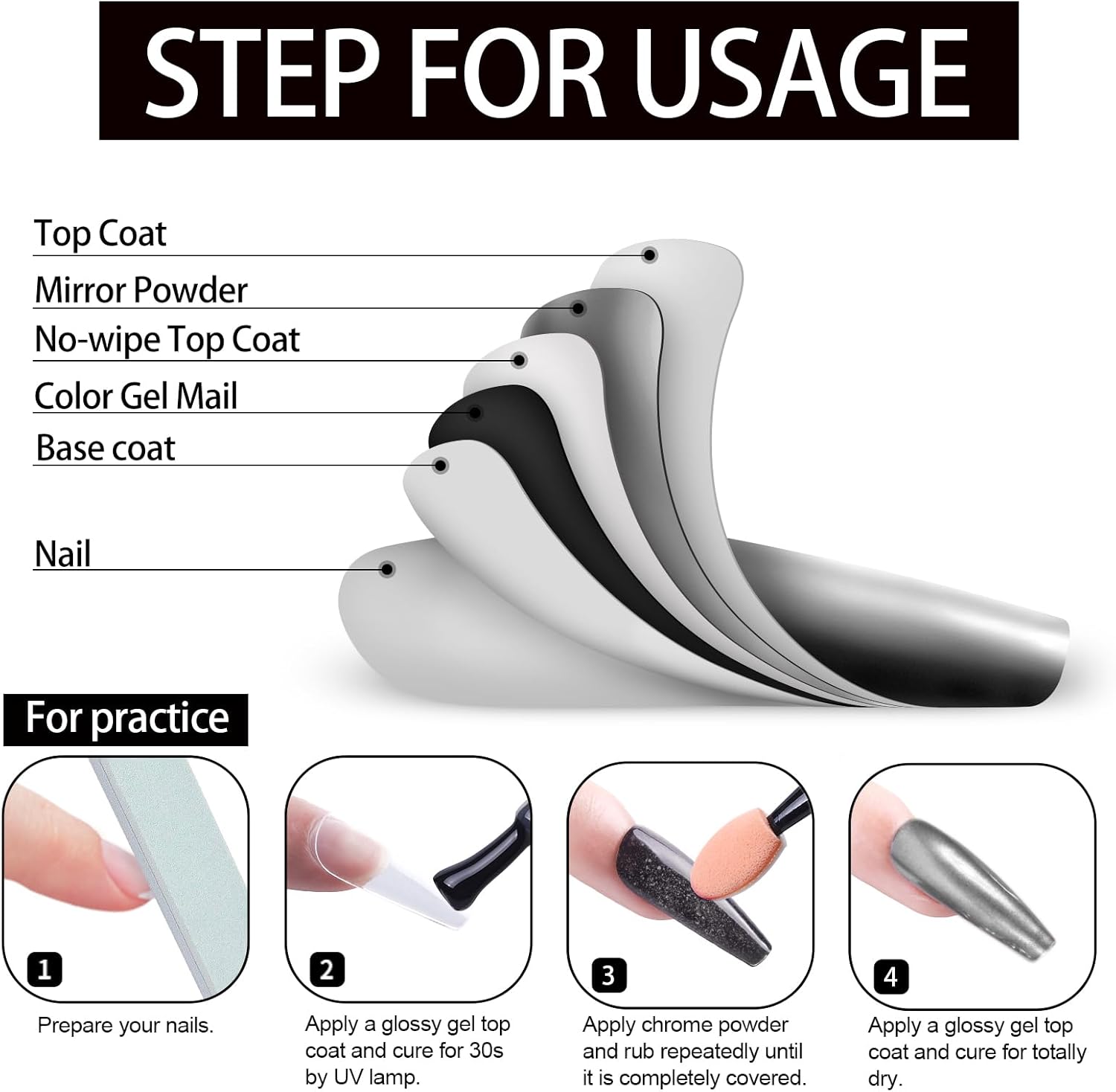 - PACKAGE CONTENTS:1 PCS chrome nail mirror pigment powders. It needs to be used with gel nail polish and no wipe top coat. They can make many different design for your gel nail polish. It gives different color base a pearly shine for your nails