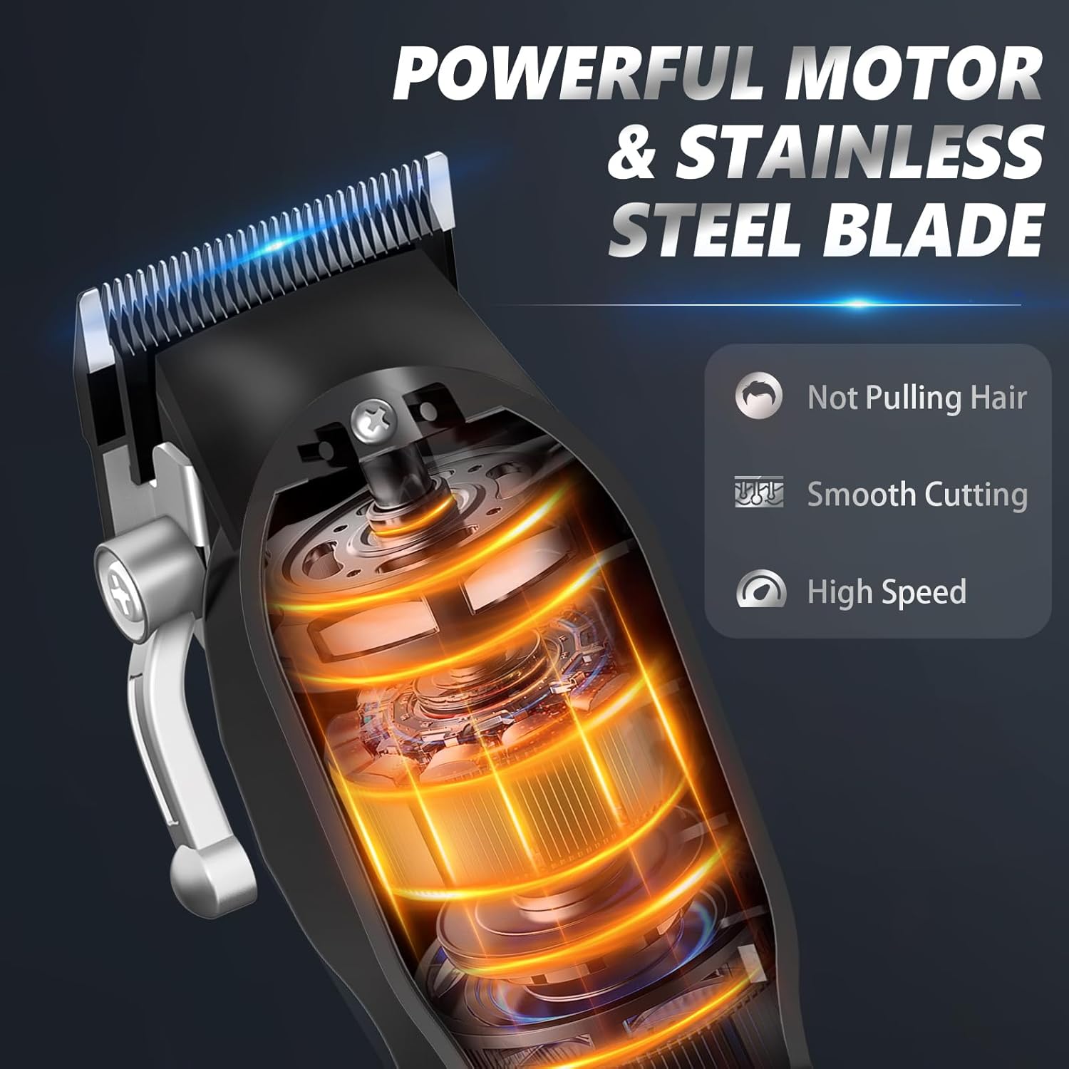 - Professional Men's Grooming Kit: Hair clippers set included powerful barber clippers and hair trimmer for men. Our professional hair clippers can meet all your manscaping needs at home, adjustable fade lever (0.8-2mm) offers precise control, you can freely adjust the length you want. The precision trimmer can manage the details of your hair and facial beard. Our hair cutting kit can trim any hair style you want.