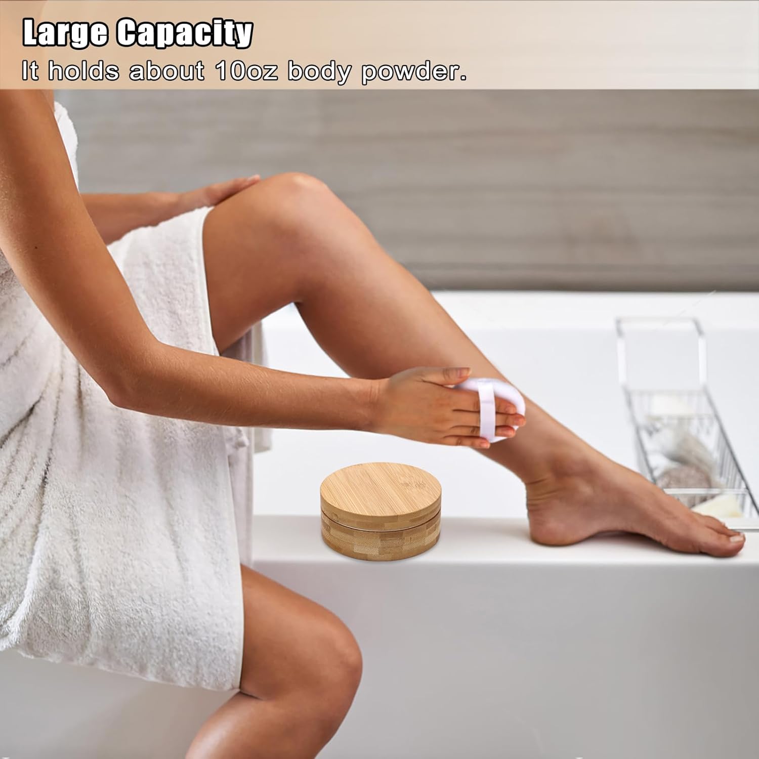 - 【Natural Powder Puff and Container】Dimensions(LxWxH): 4.5" x 4.5" x 1.9", Capacity:about 10oz body powder. The warm tones of the bamboo is very suitable for modern interior decoration and helps to create a natural, warm and comfortable atmosphere