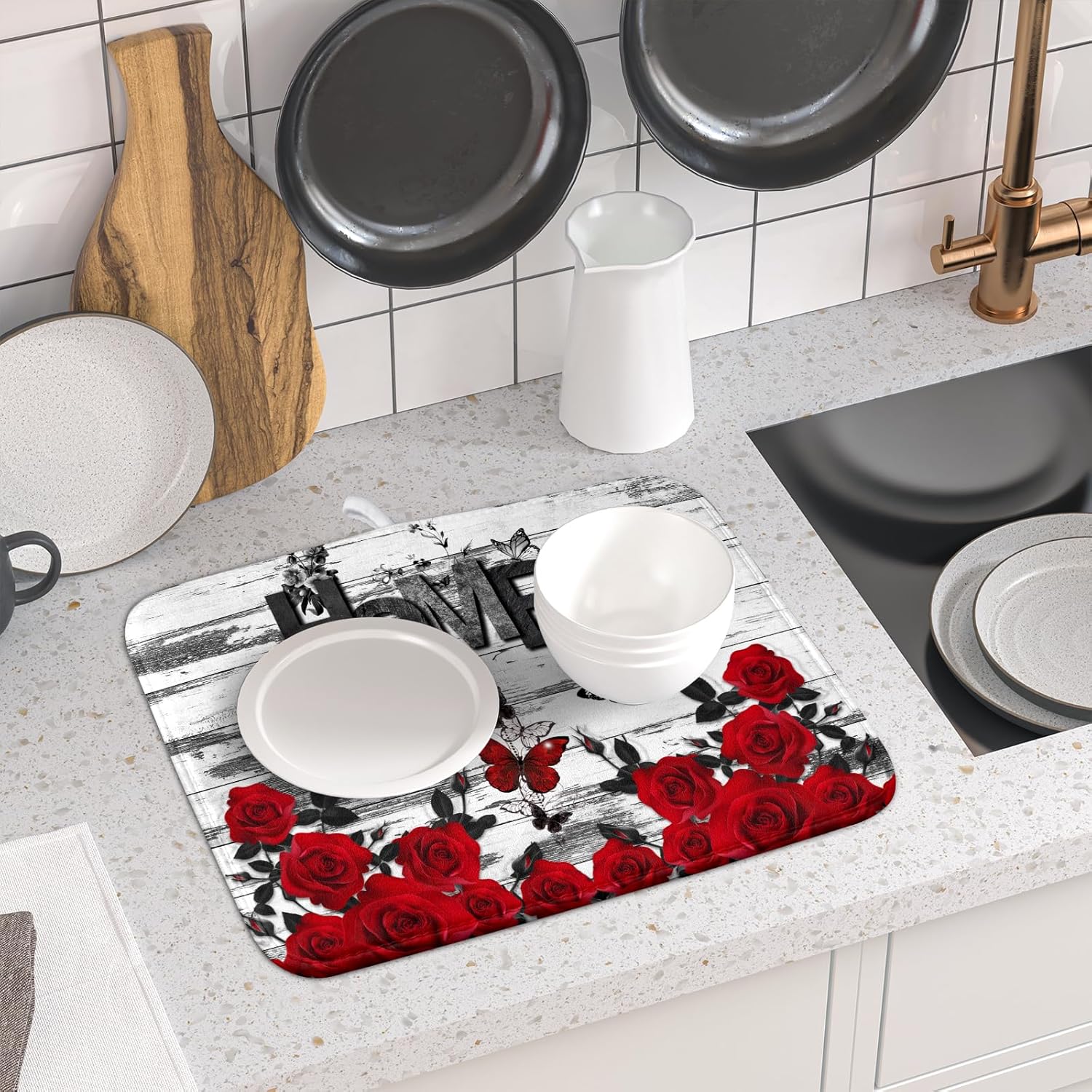 Red Rose Dish Drying Mat 16x18 inch Romantic Floral Absorbent Microfiber Sink Counter Dishware Drainer Pad for Kitchen Coffee Bar Decor