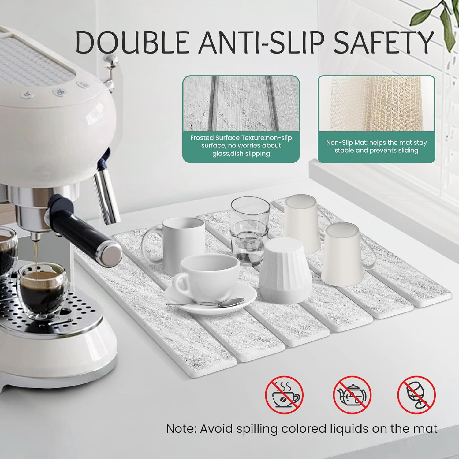 - 【Attention】:Avoid spilling dark liquids on the absorbent mat such as chili oil,soy sauce,red wine,etc.Due to stone drying mat its foldable design,there is a small spine between each panel,if the dishes or items carry a lot of water,which a lot of water will accumulate between the small spine,which is a normal phenomenon;our suggestion for this is to gently shake off the water from the washed utensils or items before placing them on the mat, or to gently wipe the accumulated water on the spine with a dry towel.