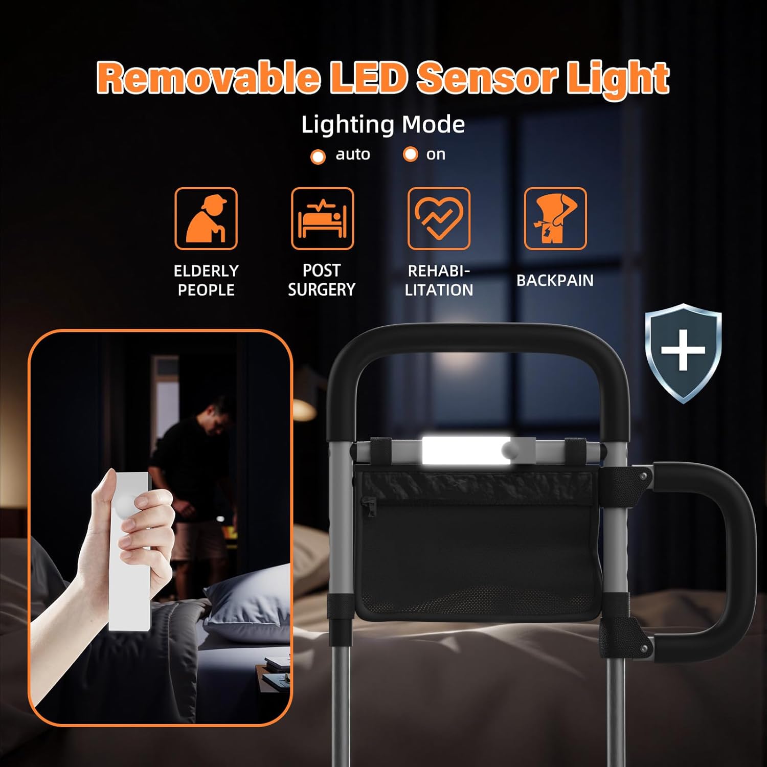 - SENSOR NIGHT LIGHT & ZIPPER STORAGE POCKET: Movable sensor LED night light with magnetic fixing design.And 3 zippered storage pockets on both sides of the bed bars for seniors can safely store your various items.