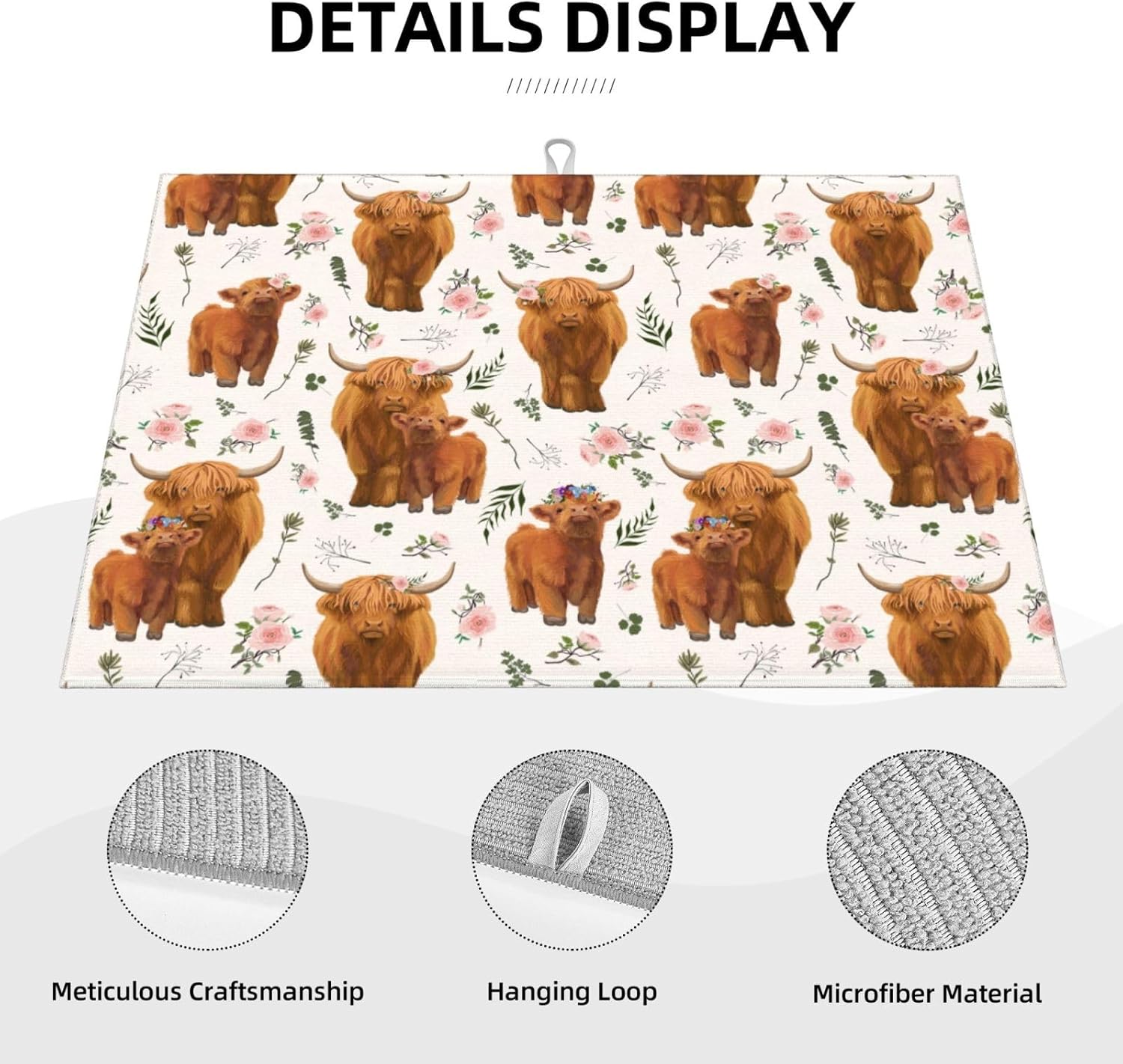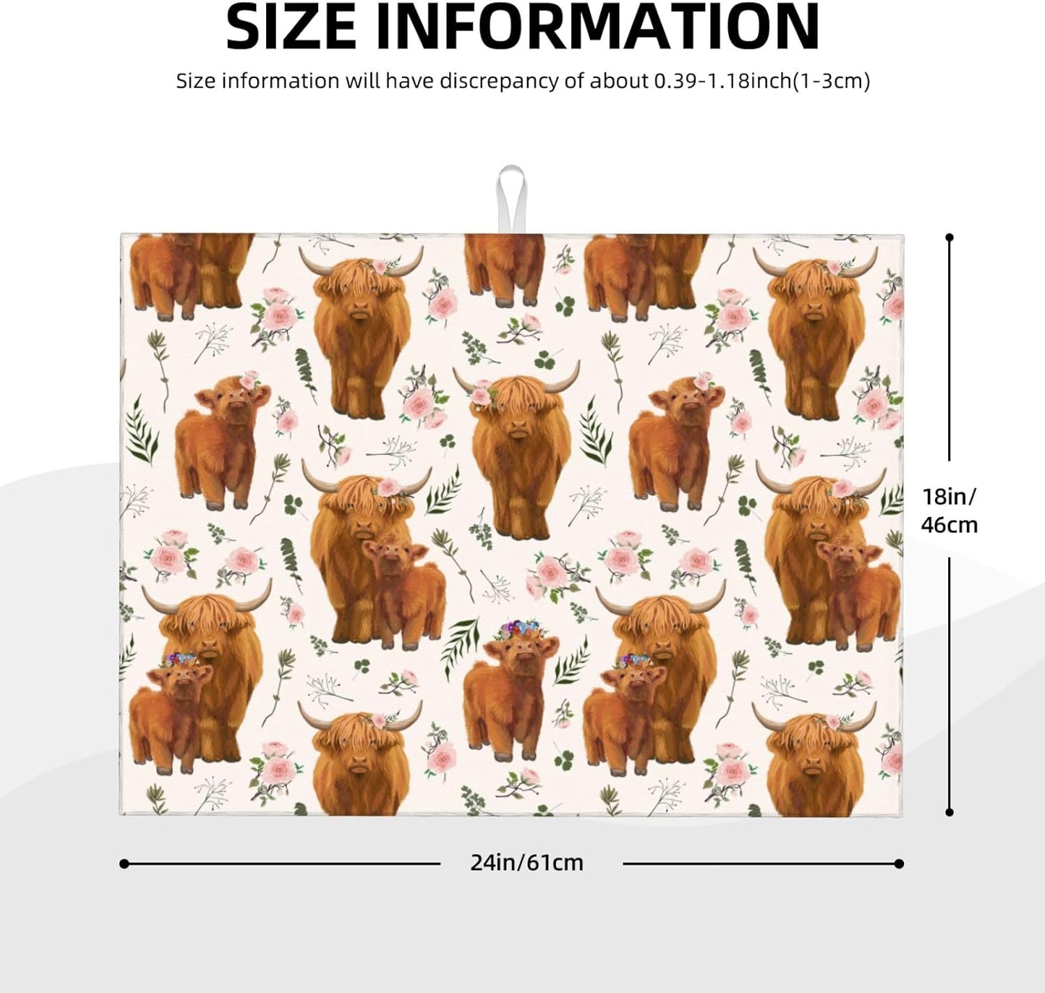 - 【Size & Quick Dry】18x24inch/45.7x60.9cm.Different design on 2 sides, one side can suck moisture with Highland Cow pattern, another one gray non-slip side.Our kitchen drying mat will suck up all the leftover wetness from your pots, pans, and dishes, and leave the underside both dry, easily keep your kitchen countertop dry and tidy.