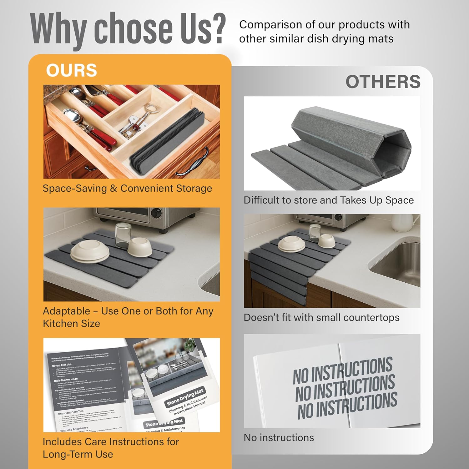 - One Set, Endless Possibilities : This 2-piece kitchen drying mat set (12'' x 16'') gives you the freedom to use it your way—drying dishes, under soap dispensers, or even as a base for indoor plants. Whether you live in a large house or a tiny apartment, this stone kitchen drying mat adapts to your space.