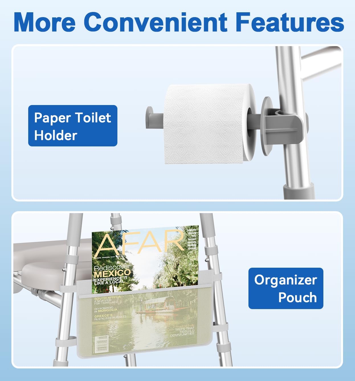 - Included Convenience Kit. Designed for ease and independence, this handicap toilet seat includes a built-in magazine holder and toilet paper rack, keeping essentials within arm’s reach. Whether holding a book, phone, or tissues, it enhances comfort, making bathroom use more effortless for seniors and those with mobility challenges