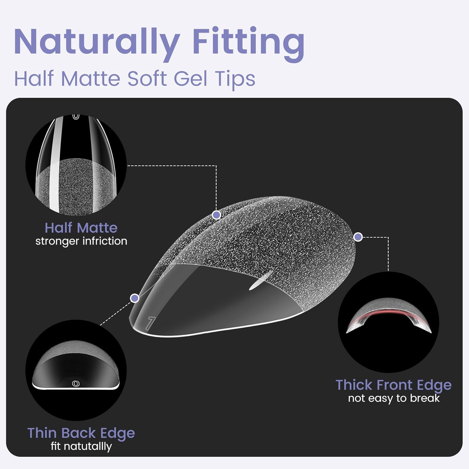 - 0 Pressure Breathable Feeling - Wilfniee xs short almond shaped nail tips designd with â Thin back edge, thick front edgeâfor natural fit effect. The thinner back edge can make the soft nail tips fit your nails better, which will not make you feel uncomfortable. Also, the clear nail tips are more breathable, which will not cause burden and pressure on your fingers; The thickened front edge makes it not easy to break or bend for last long time use. Just like grows on you, prefect fitting