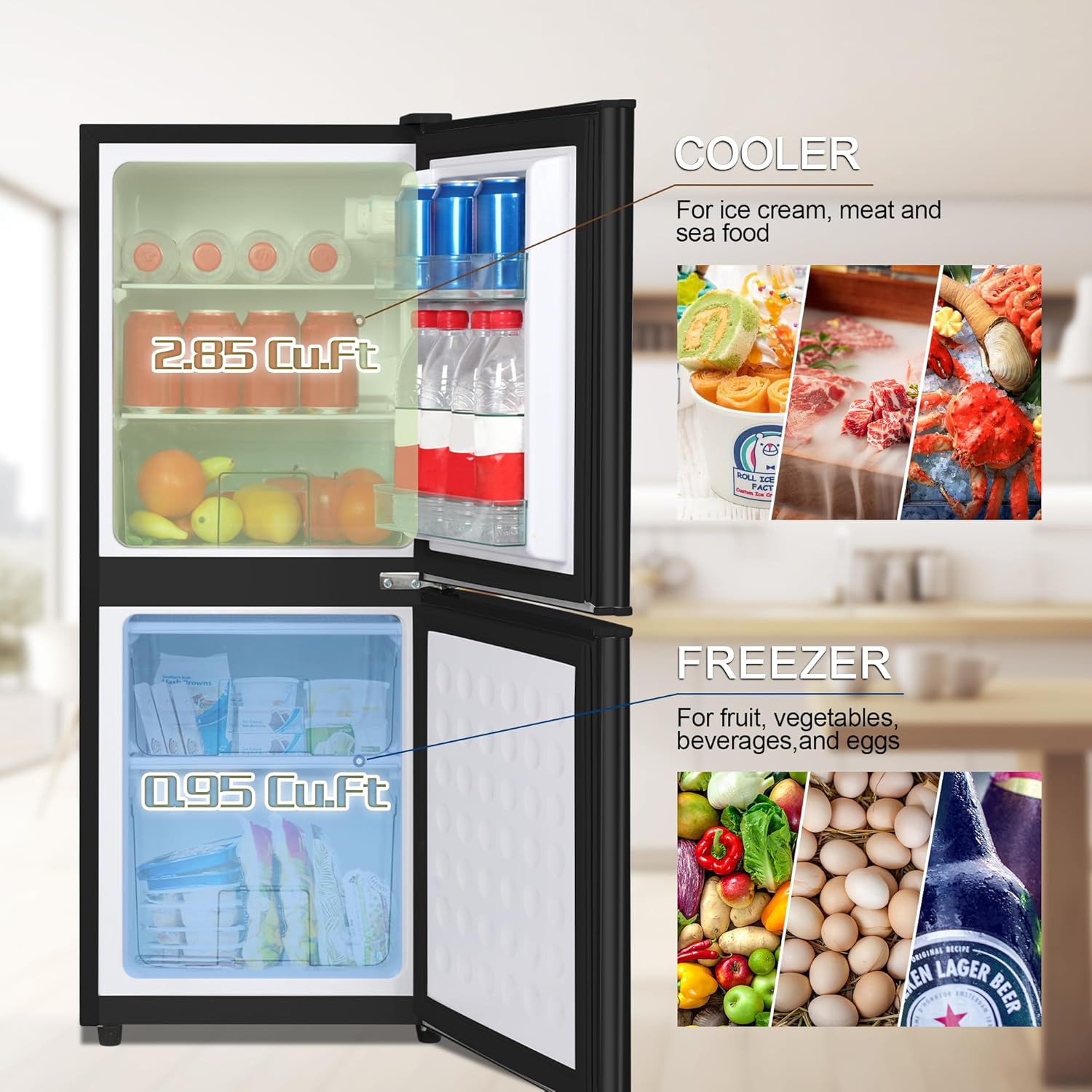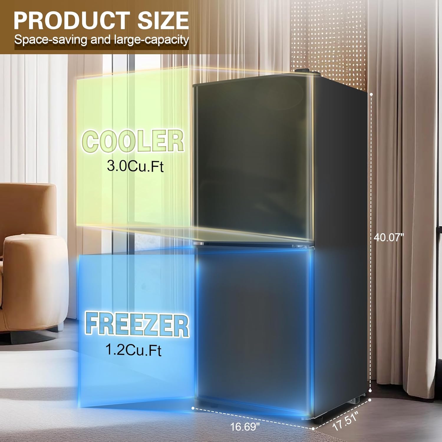 - đ§ă2-Door Fridge and FreezerăEnjoy the convenience of a 2-door small refrigerator with freezer, offering a spacious 3.0 Cu. Ft. refrigeration compartment and a separate 1.2 Cu. Ft. freezer compartment. This allows you to easily store and organize a variety of food and drinks, ensuring that everything has its designated space. From fresh produce to frozen treats, our mini fridge provides the perfect solution for all your storage needs with the 7-level thermostat control.