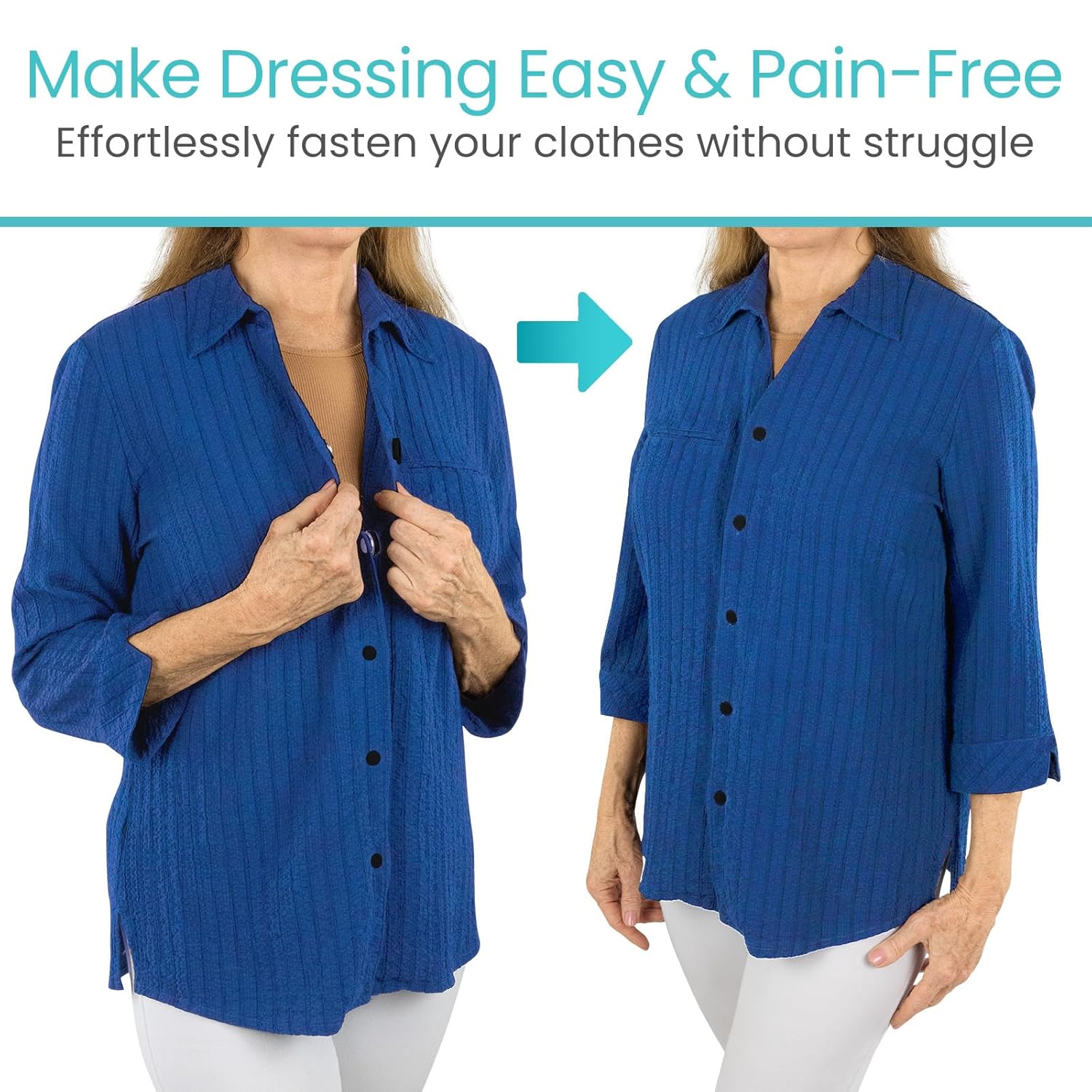 - EFFORTLESSLY DRESS AND UNDRESS: Get ready for your day with a hassle-free fastening aid that seamlessly snaps into place. With a carefully designed closure system that fits over existing buttons, you can simply tap and gently tug clothing to open and close the buttons. For greater convenience and enhanced independence, while getting ready for your day, the Button Helper provides easy-to-use adaptable support.