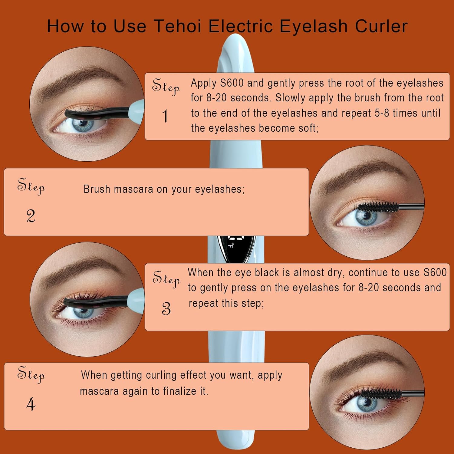 - 【Rapid & Natural Curl】 Say goodbye to clunky curlers! Our electric eyelash curler heats up in just 10+ seconds, no need to wait for a long time. Its uniquely curved head quickly creates the perfect natural curl for your eye makeup. Increase temperature for an even better result. Paired with mascara, it easily separates lashes and ensures a 24 - hour long - lasting natural curl, giving you a stunning, eye-catching look.