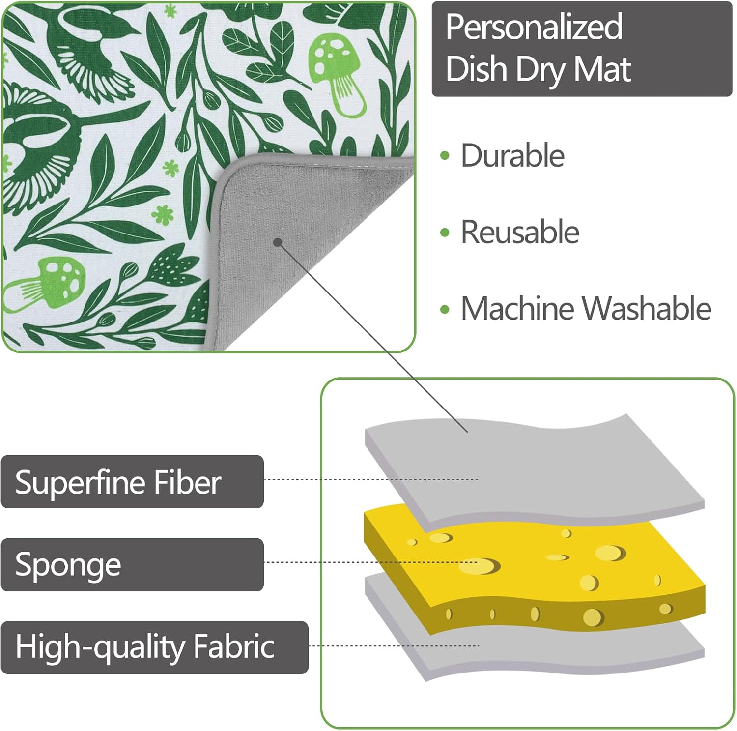 SHIYUE Dish Drying Mat for Kitchen Counter Super Absorbent Spring Kitchen Decor Microfiber Drying Matainers Rack Fast Pad Dish Drainer Mats(Green Flower Bird,16''x18'')