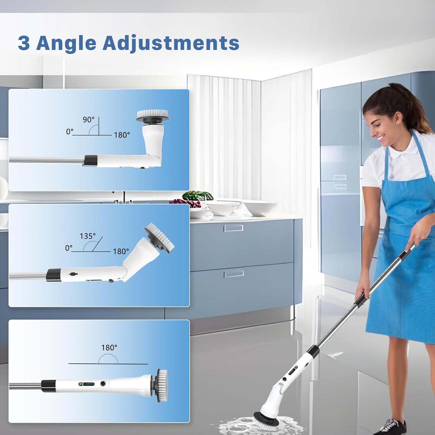 - 【3 Adjustable Heights for Pain-Free Cleaning】Designed for American households, this ergonomic electric scrubber offers 12", 43", and 54" length settings to fit all users—no bending, no backaches! Effortlessly rotate the handle to customize the height, reaching floors, ceilings, and tight corners with ease. Ideal for multi-story homes, seniors, or busy families, its lightweight build and intuitive design turn chores into comfort. Say goodbye to strain and hello to spotless spaces.