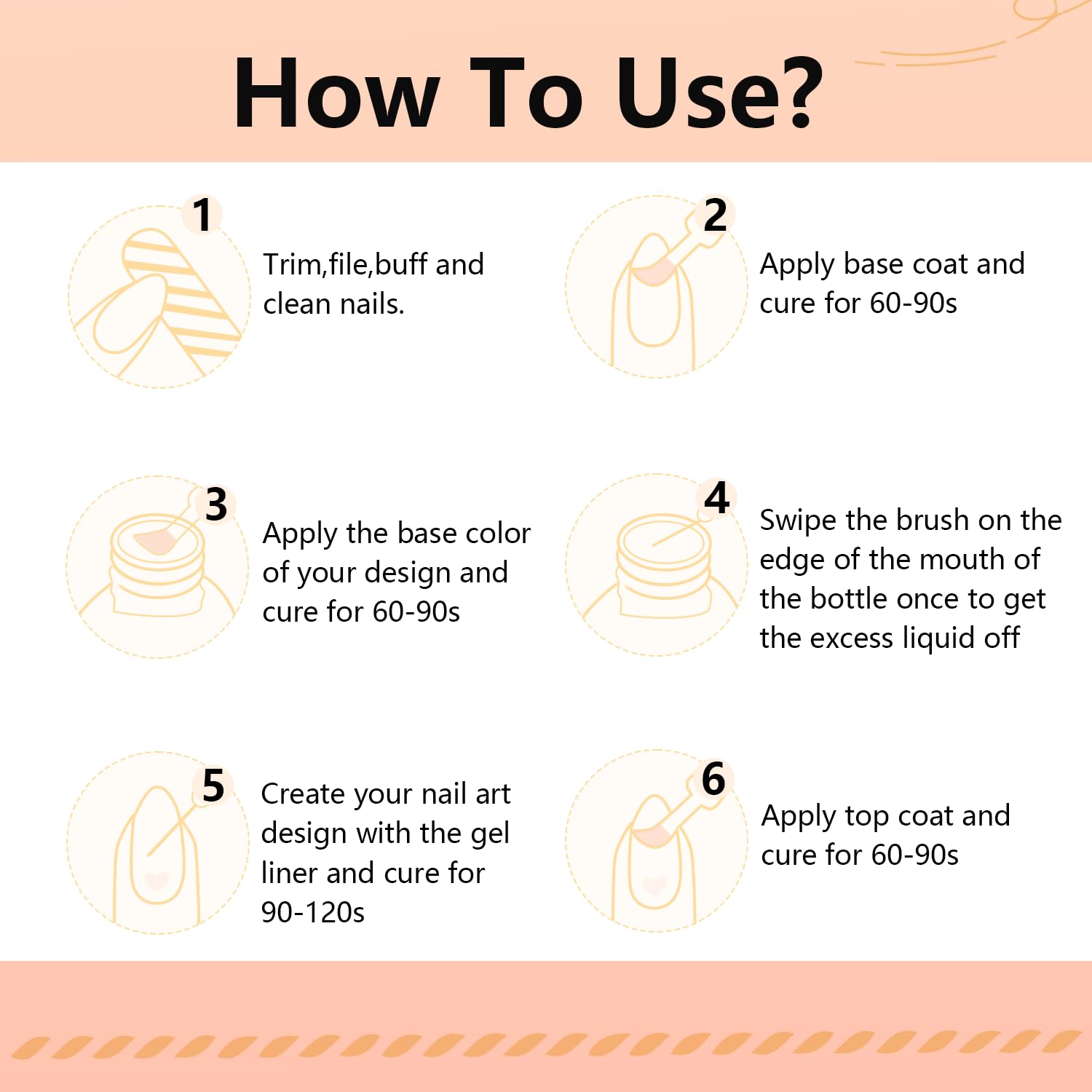 - Nail Lamp Curing: Nail Art Gel Base Coat Set Brush is simple, easy and fast to operate , LED nail lamps have an average curing time of 60-120 seconds and require a base coat and top coat.