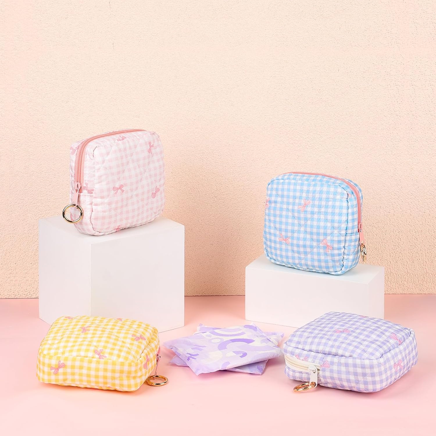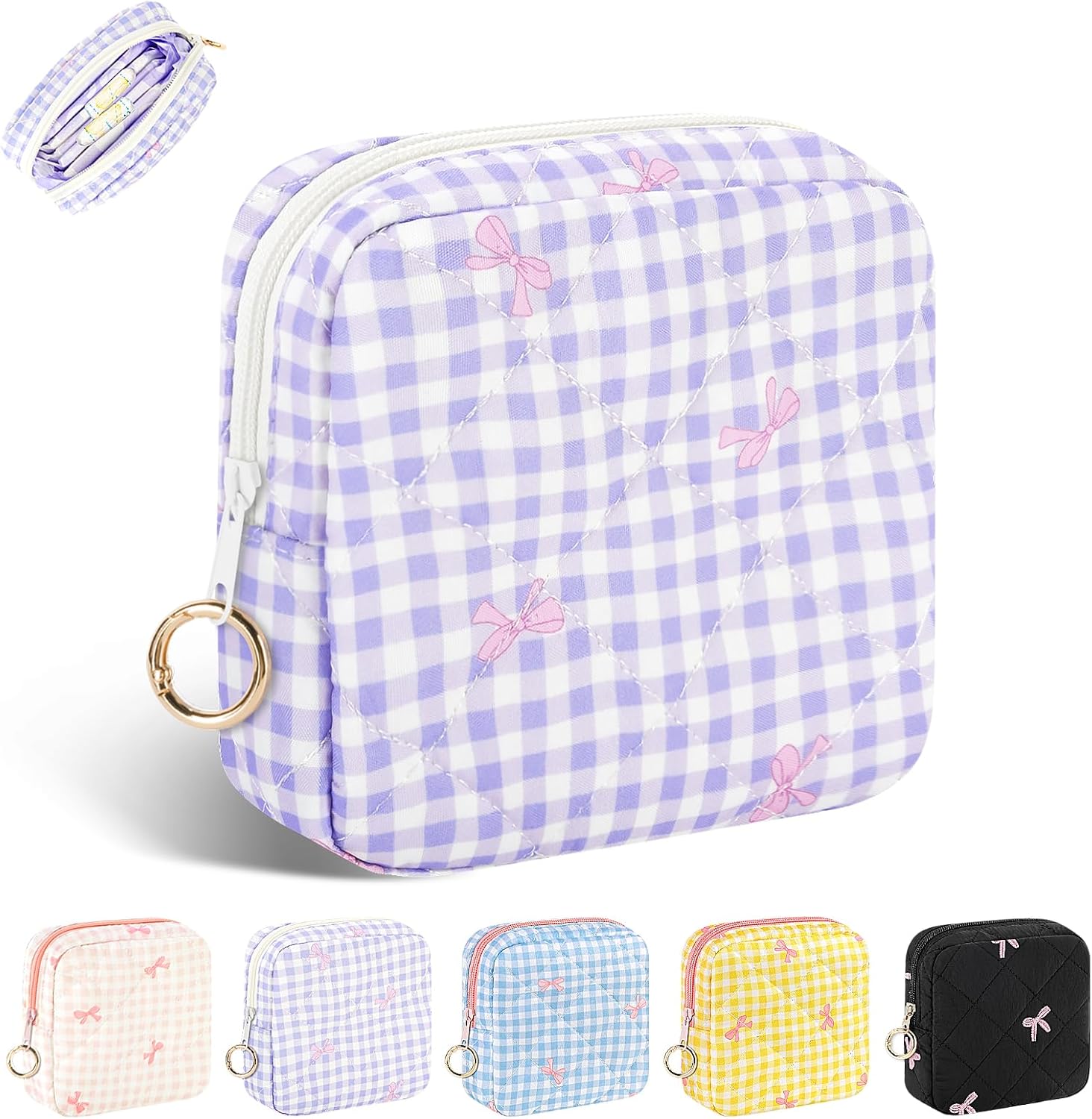 Period Bag for Teen Girls, Quilted Sanitary Napkin Storage Bag, Cute Bow Tie Menstrual Pad Pouch Tampon Holder (Plaid-Purple)