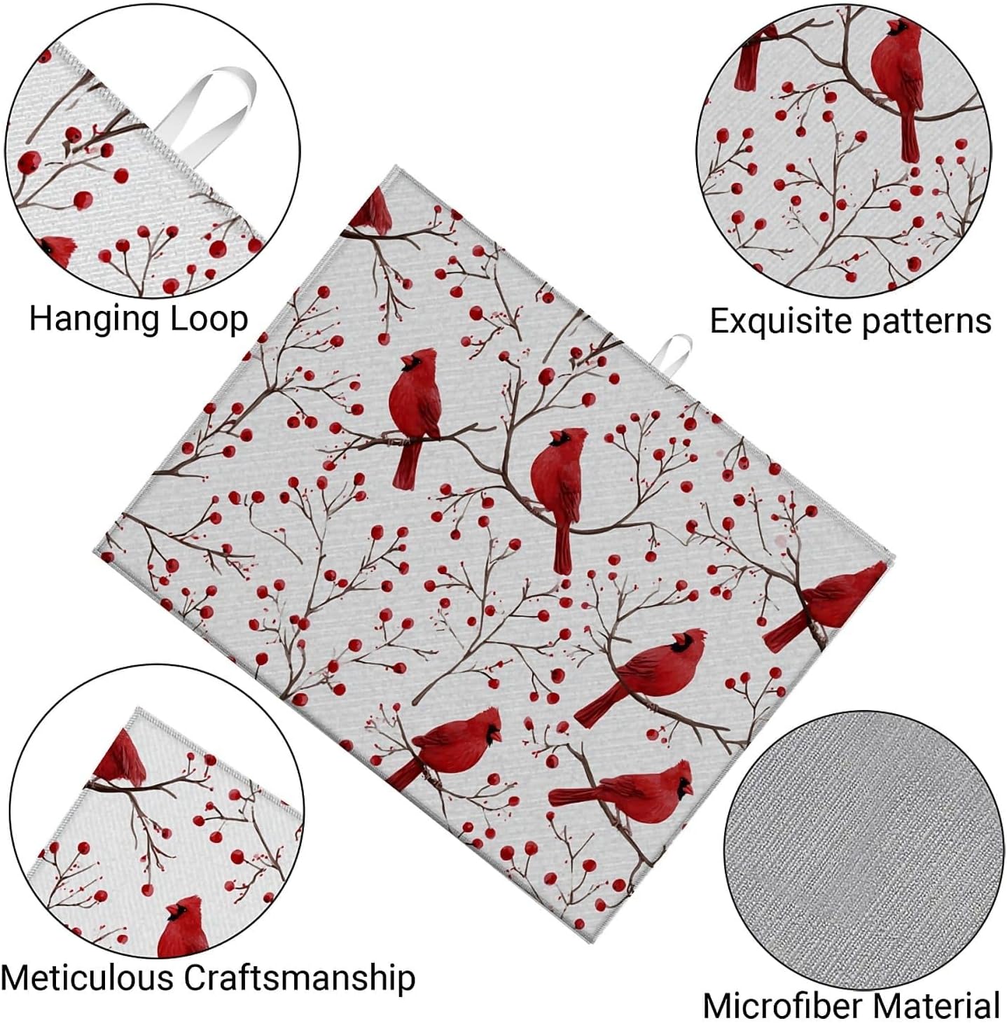 Dish Drying Mat For Kitchen Counter, Cardinal Bird Red Berry Microfiber Absorbent Dish Drainer Rack Pad Reusable Large 18x24in Drying Mat
