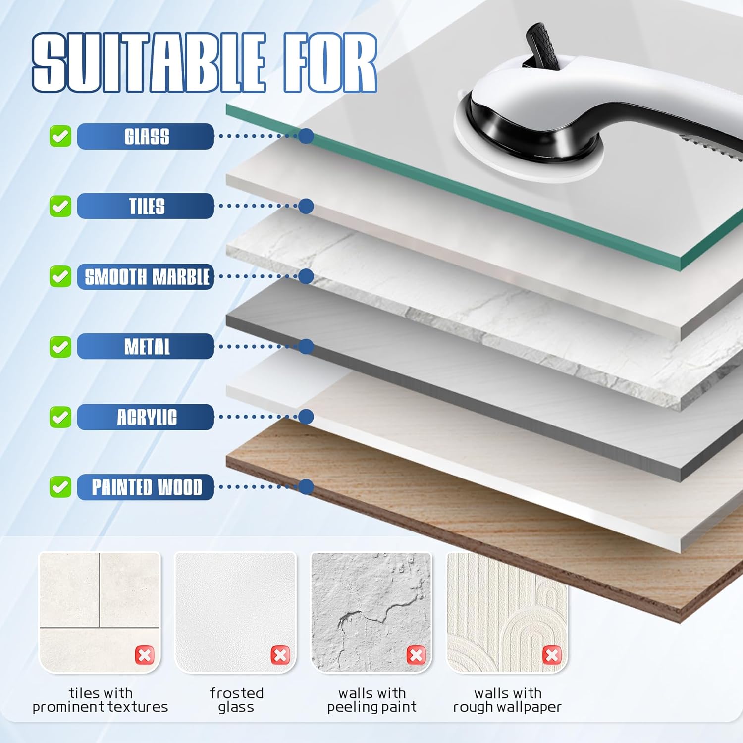- For Smooth Surfaces Only - The shower safety bars for seniors works best on non-porous surfaces like glass, ceramic tile, marble, metal, acrylic, or lacquered wood. Not suitable for grout lines or textured walls. Always check suction weeklyâespecially when the grab bar used by children, seniors, or post-surgery.