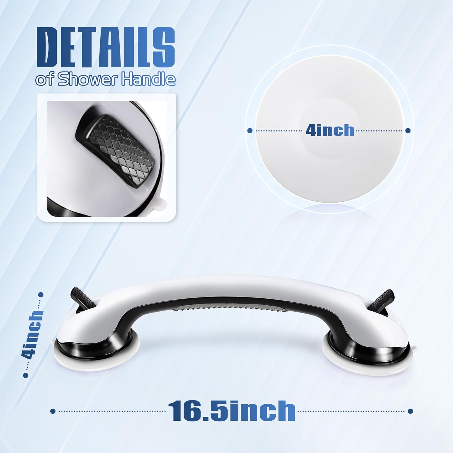 - Comfort Grip, Long-Lasting Build - Shower grab bars suction crafted from durable plastic with flexible rubber suction cups, the ergonomic shower handle offer a secure, non-slip grip. Measuring 16" Ă 4", the grab bars for shower are perfectly sized for daily stability and comfort.