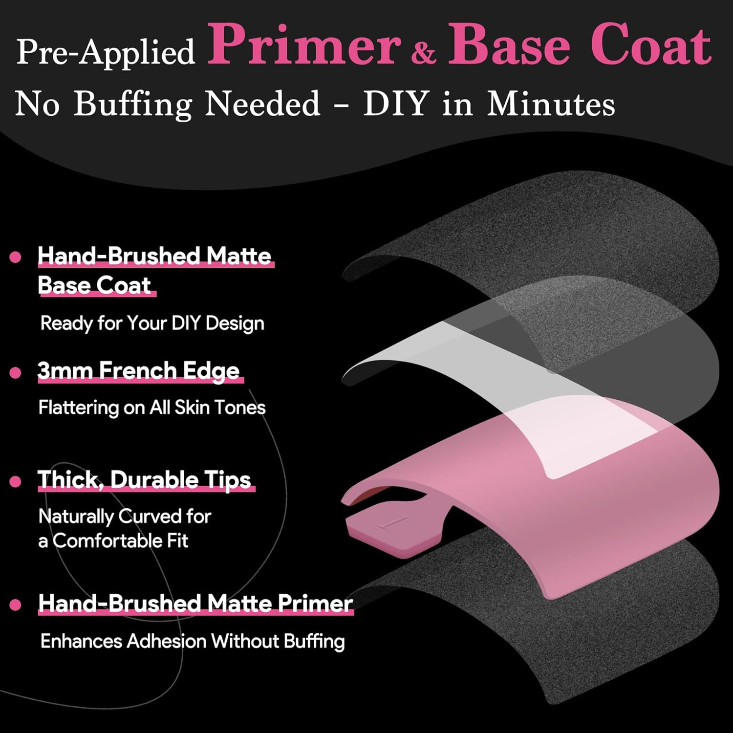 - Pre-Coated with Primer & Matte Base: Instant Art-Ready, each toenail press ons tip comes with hand-applied primer and base coat, ready for design. No buffing needed! The matte finish allows easy DIYâpaint, decorate, or add rhinestones, get a salon-quality DIY pedicure in just 10 minutes, even if you're a beginner!