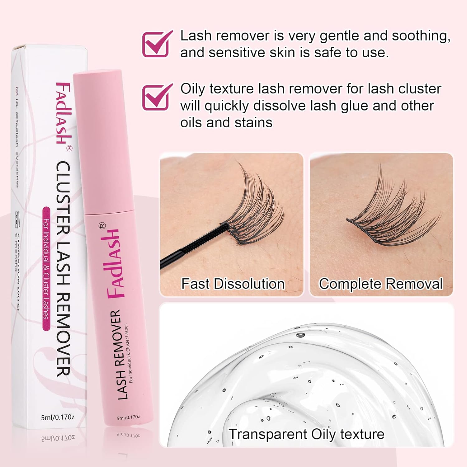 - Mild Formula: Cluster lash remover use safe formula, professionally tested many times, Our lash remover is very gentle and soothing, and sensitive skin is suitable to use.FADLASH lash remover for cluster lashes can be used on multiple types of lashes, so if you use clusters, false lashes, and strip lashes regularly and are looking for a good lash remover, look no further again! Click to take it homeďź