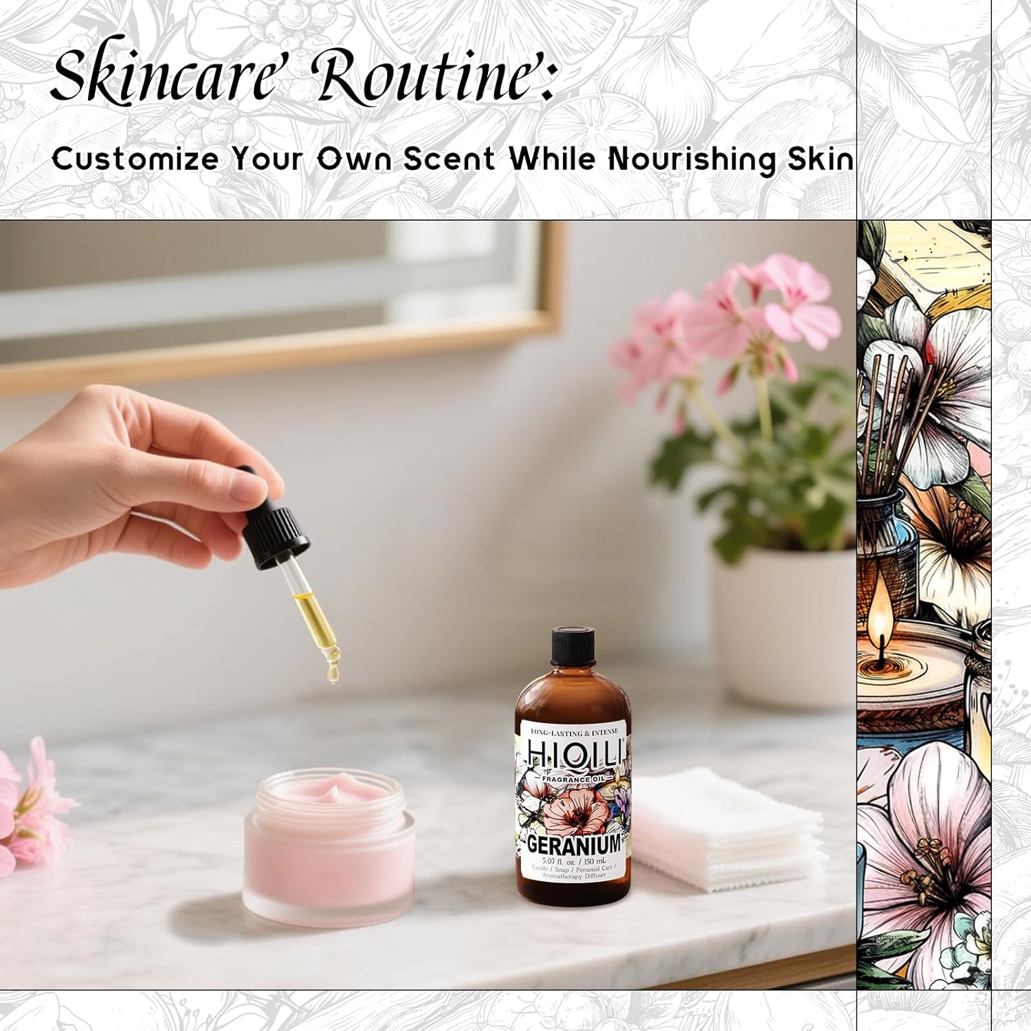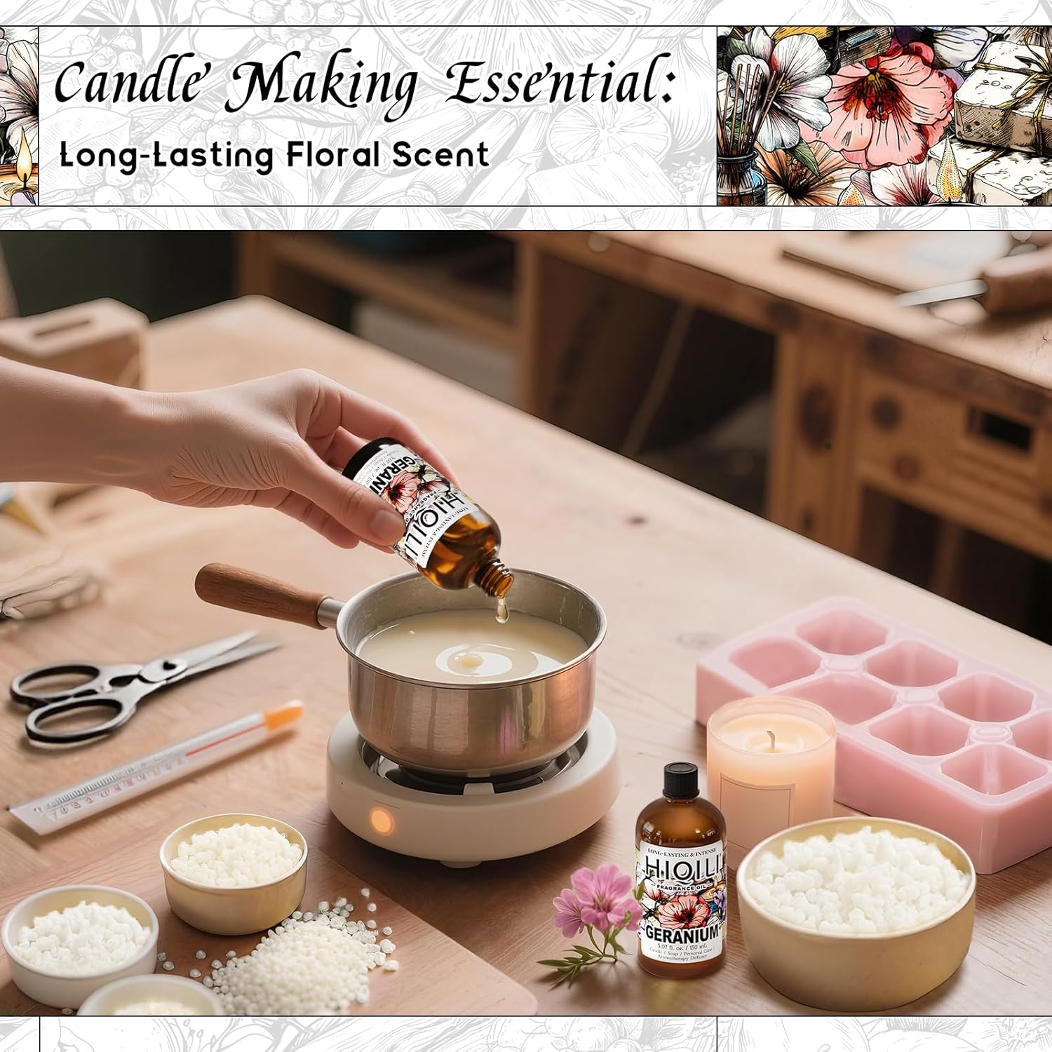 HIQILI Geranium Fragrance Oil for Home Diffuser, Relaxation, Essential Oil for Candle & Soap Making, Long-Lasting Scents, Car Freshies - 5.07 Fl Oz