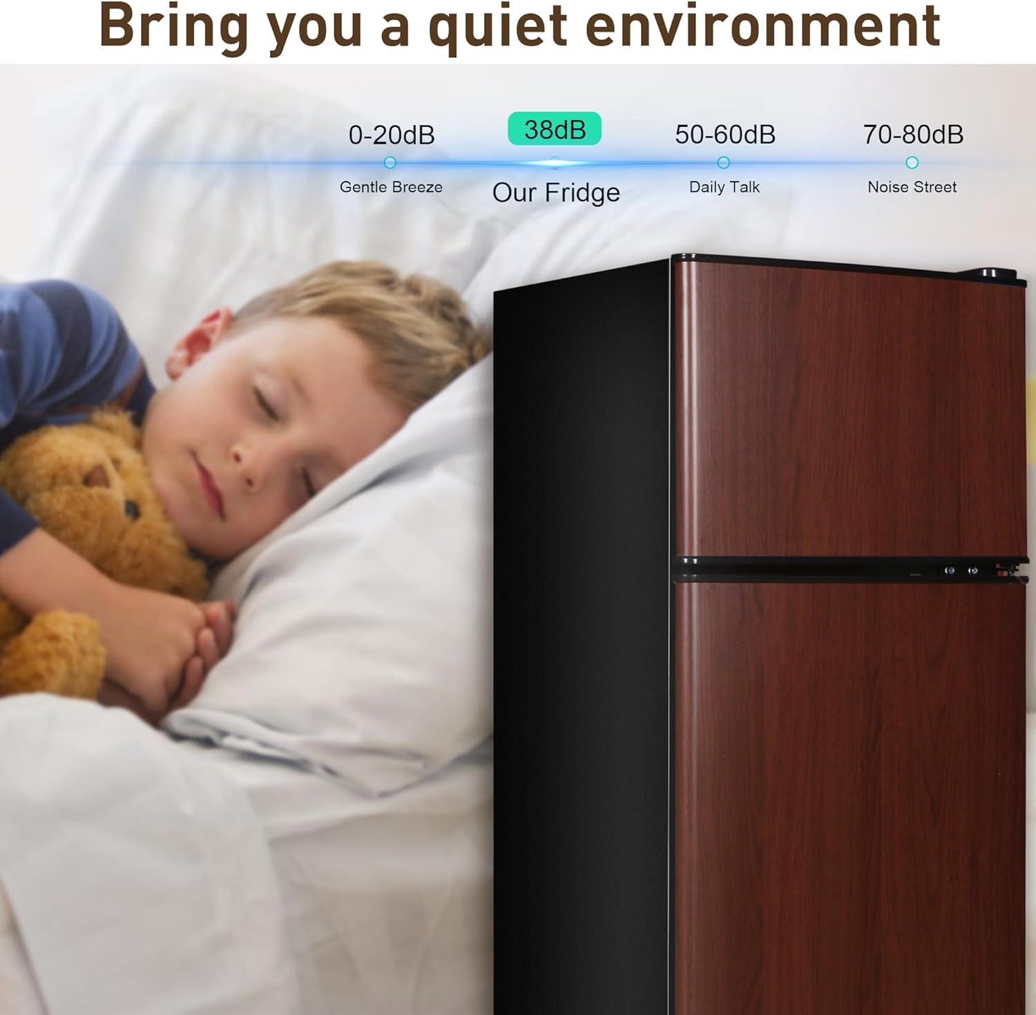 Mini Fridge with Freezer, 3.2 Cu. Ft. Small Fridges with Freezer, Refrigerators Adjustable Thermostat, Apartment Size Refrigerator with Freezers for Office, Apartment, Dorm, Kitchen, Wood
