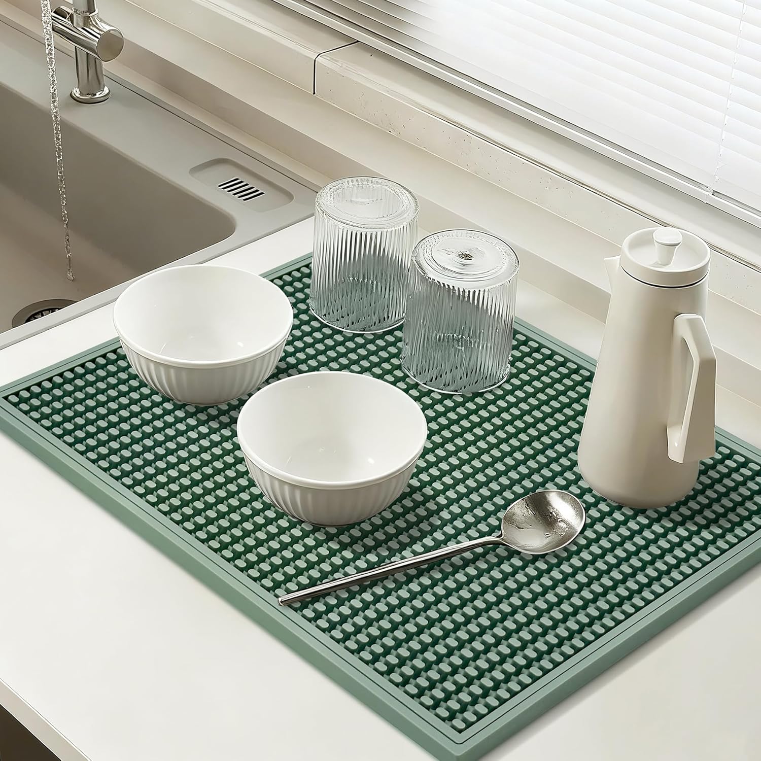 - Superior Drainage & Ventilation: Engineered with deep grooves and elevated ridges, this dish drying mats for kitchen counter promotes rapid airflow and prevents water pooling. Spills stay contained within the edges, keeping countertops dry and tidy. Say goodbye to soggy dish mat drying kitchen mat messes and hello to faster drying times!