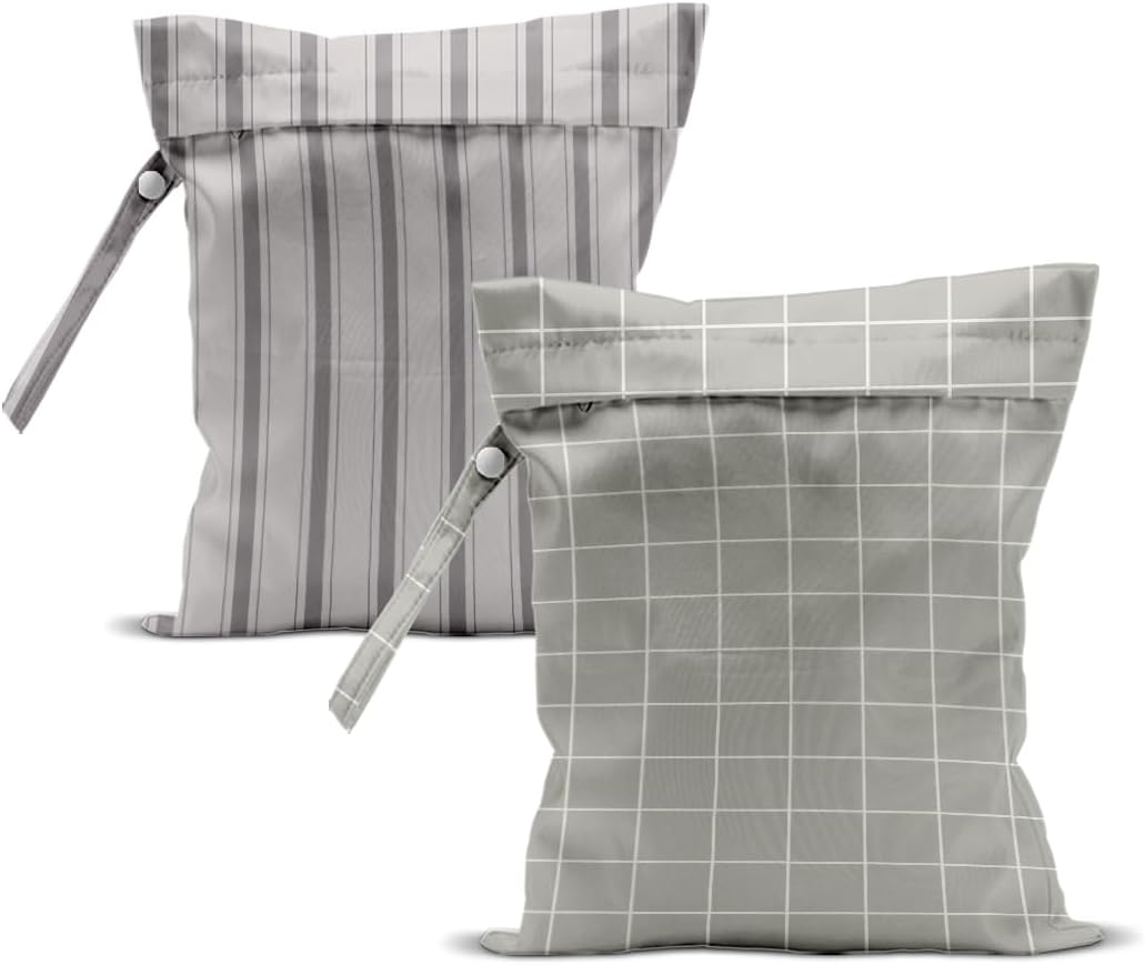 2Pcs Stripe Wet Bag 12x10 Inch, Grid Waterproof Reusable Wet Dry Bags, Rustic Washable Travel Laundry Bags for Swimsuit Pool Beach Diapers Dirty Yoga Gym Clothes, Travel Gifts for Women Friend