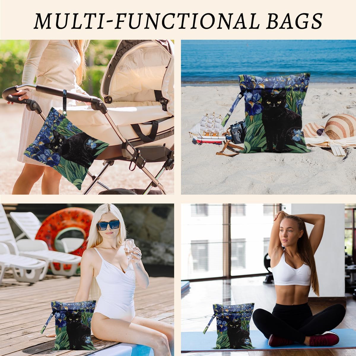 Cat Wet Bags 12x10 Inch, Blue Floral Waterproof Reusable Wet Dry Bags, Flowers Washable Travel Laundry Bag for Swimsuit Pool Beach Diapers Dirty Yoga Gym Clothes, Cat Gifts for Women Friend Travelers