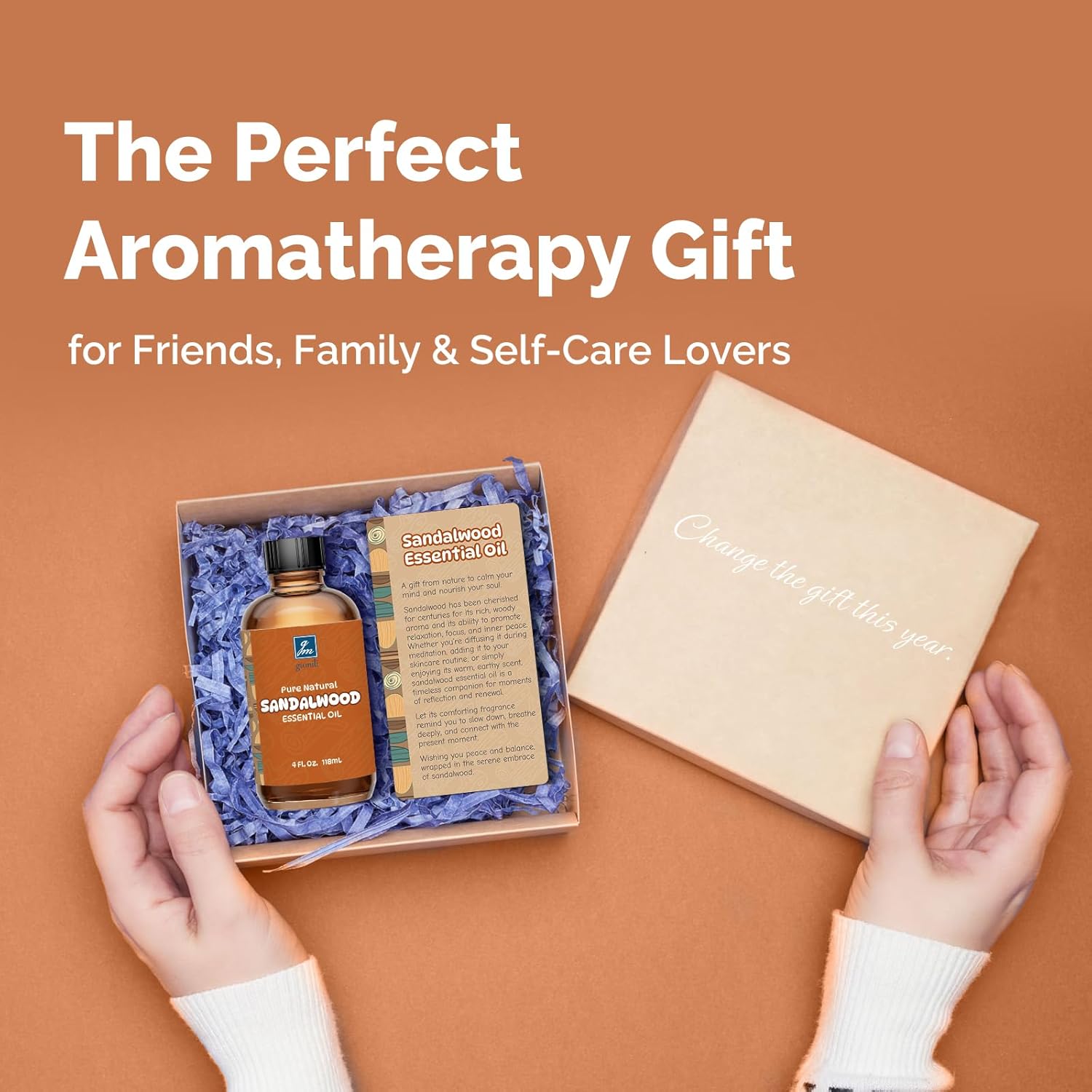 - 100% Pure Sandalwood Essential Oil: Premium 4oz sandalwood essential oil, steam-distilled for a warm, woodsy aroma. Perfect for diffuser, skin care, hair, and aromatherapy uses.