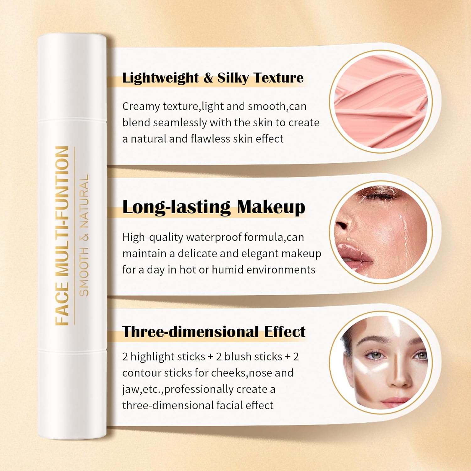 - 【Versatile Shade】Highlight sticks enhance facial features,making the skin translucent and natural;the light contour sticks creates a three-dimensional shadow,and the dark contour stick creates a warm bronze shade;blush sticks add a rosy luster to the face and enhances the makeup texture