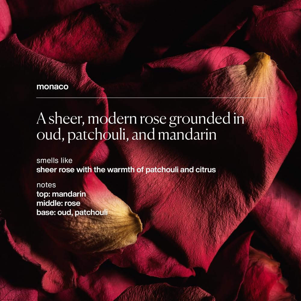 - ROSE, MANDARIN, OUD & PATCHOULI FRAGRANCE: Enjoy the alluring scent of Monaco, a blend of sheer, modern rose grounded in oud, patchouli, and mandarin with our heat activated fragrance.