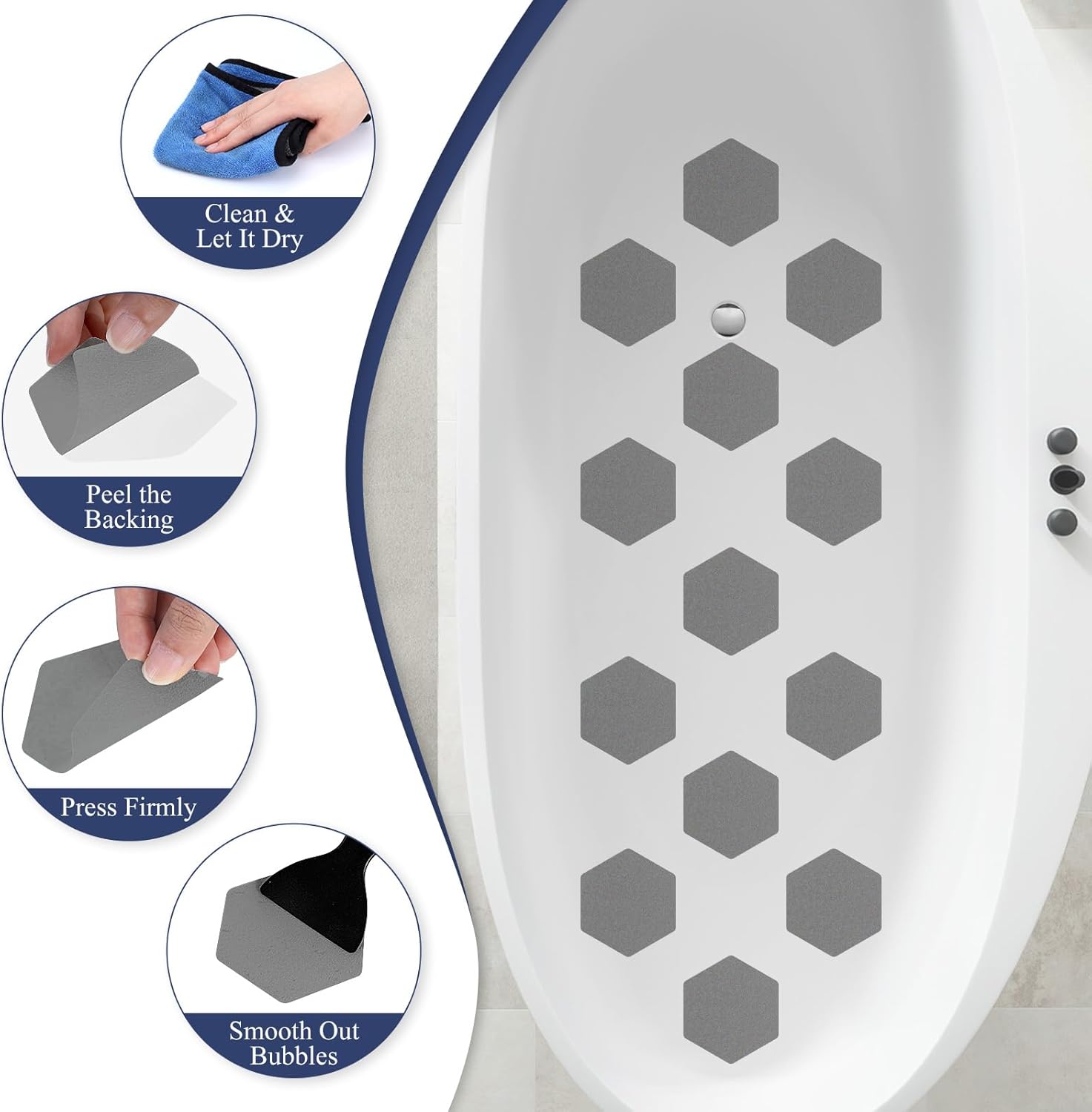 28 PCS Shower Floor Non Slip Stickers with Strong Adhesive, Invisible & Durable Anti Slip Shower Stickers with Scraper for Bath Tub, Pools and Stairs(Grey,Hexagon)