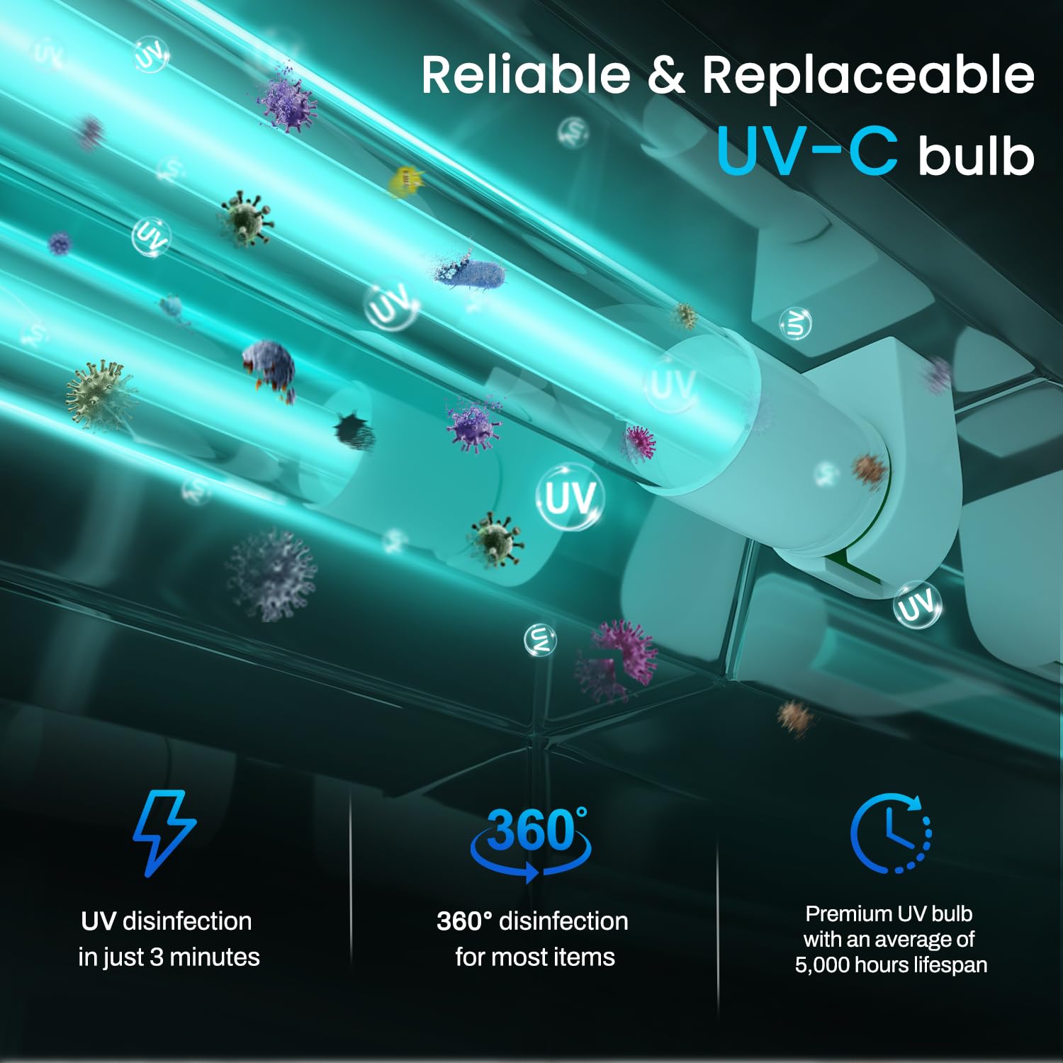 - 360° Disinfection: Featured a durable and replaceable UV bulb, the sanitizer cabinet disinfects most items efficiently and thoroughly in just 3 minutes