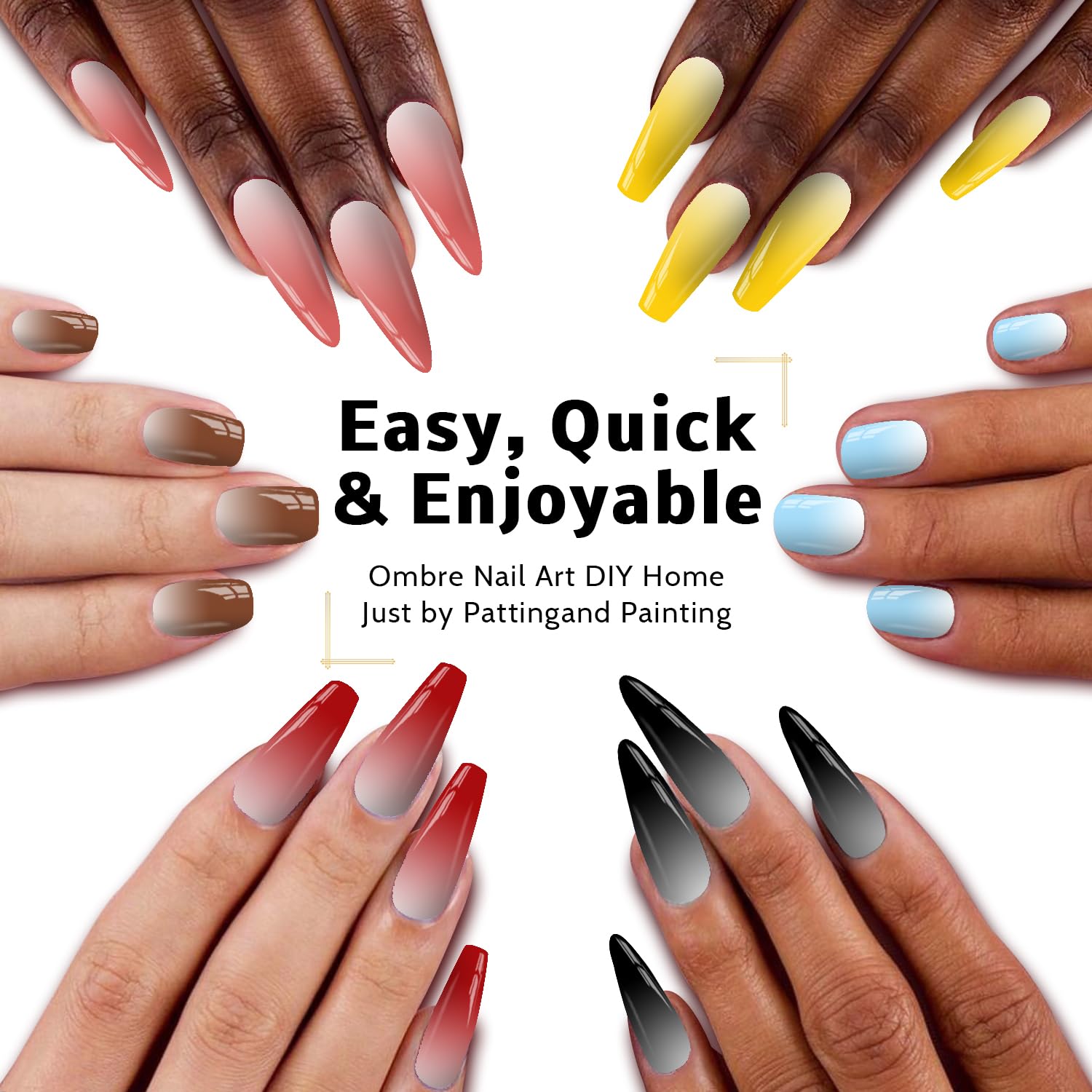 - 【HAVE FUN:】Karroy ombre nail gel will bring you great fun by self-coloring mixing, sponge-patting painting, brushes drawing & dotting, ect. It's easy, colorful, and wonderful! Package list: 9-Color Palette, 6PCS Nail Art Brushes, 1 Grabber, 100PCS Nail Sponges.
