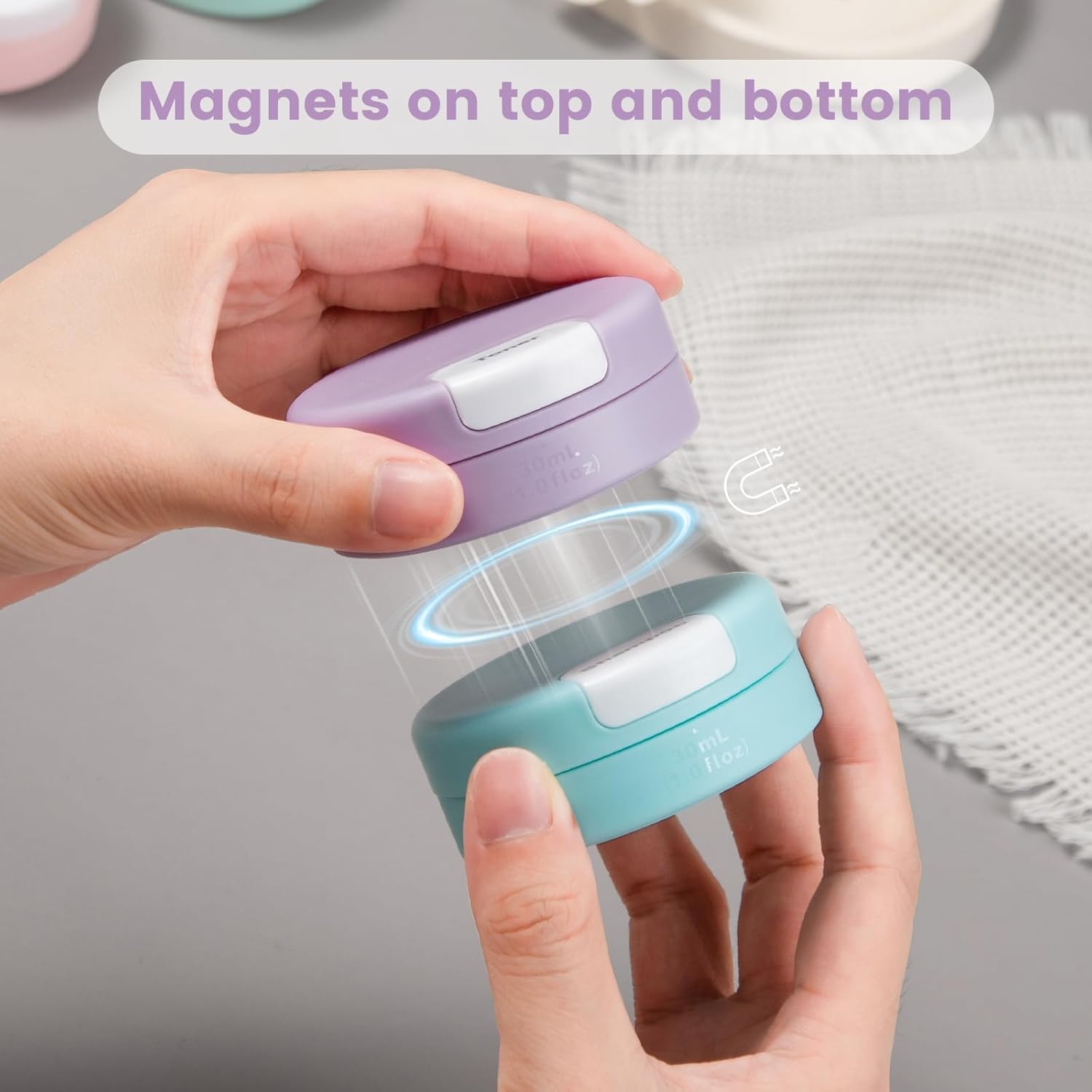 - Magnetic Design: Our travel containers feature a magnetic design that connects each container vertically. They include magnetic labels that seamlessly swap between all of Capsules.