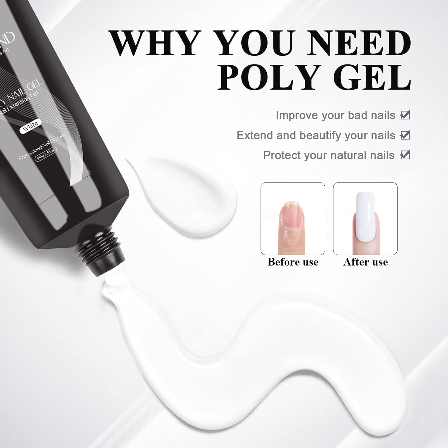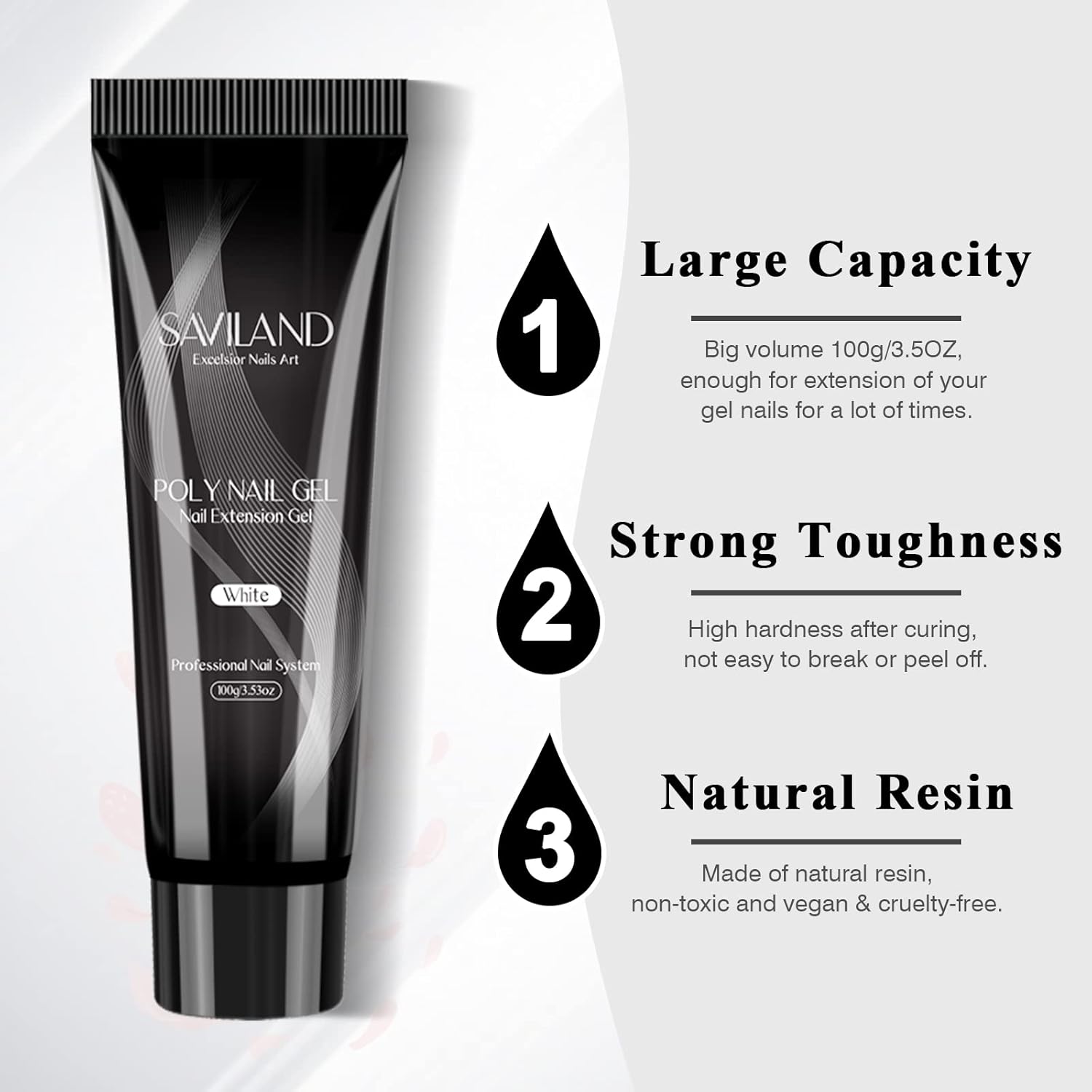 - đˇ SAVILAND WHITE POLY NAIL GEL-Saviland 100g/3.5oz white poly extension gel with popular classic color, can do nail extension, poly gel nails, nail enhancement, nail art, stick sequins or decorations, etc. 100g super large capacity, valuable, and long service life. It is very suitable for professional nail salons and nail lovers who often make extension. Can mix with other colorful gel to create various and attractive nail art.