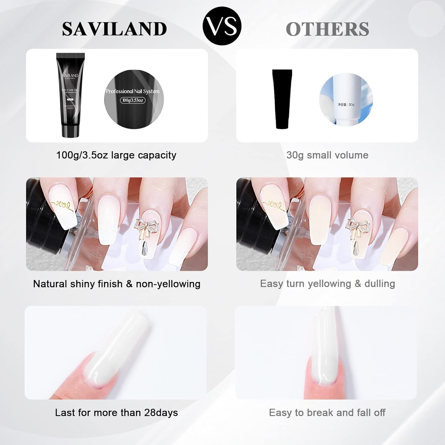 - đˇ LONG-LASTING & EXQUISITE PACKAGE-Saviland poly gel is durable, the finish effect from poly extension gel can last for more than 21 days. And the packing is high quality, soft hose, sealed and no leaking, easy to squeeze out. And it is also an ideal gift for yourself or your friends who are keen on doing nail designs.