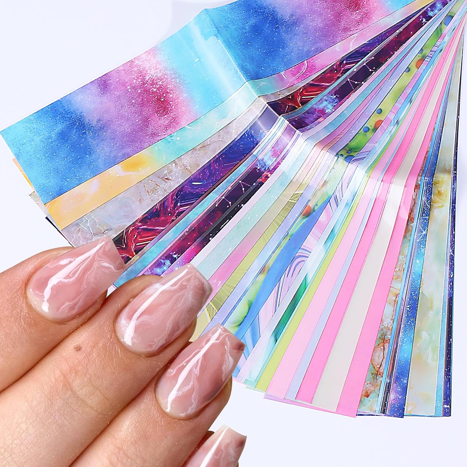 - Holographic Foils for Nails: This set of holographic transfer nail art foils stickers has a very unique design, 50 different styles, with starry sky marble radiant rainbow gradient and other patterns, you can do full-coverage nails or embellish your nails, easy to create your DIY nail design.